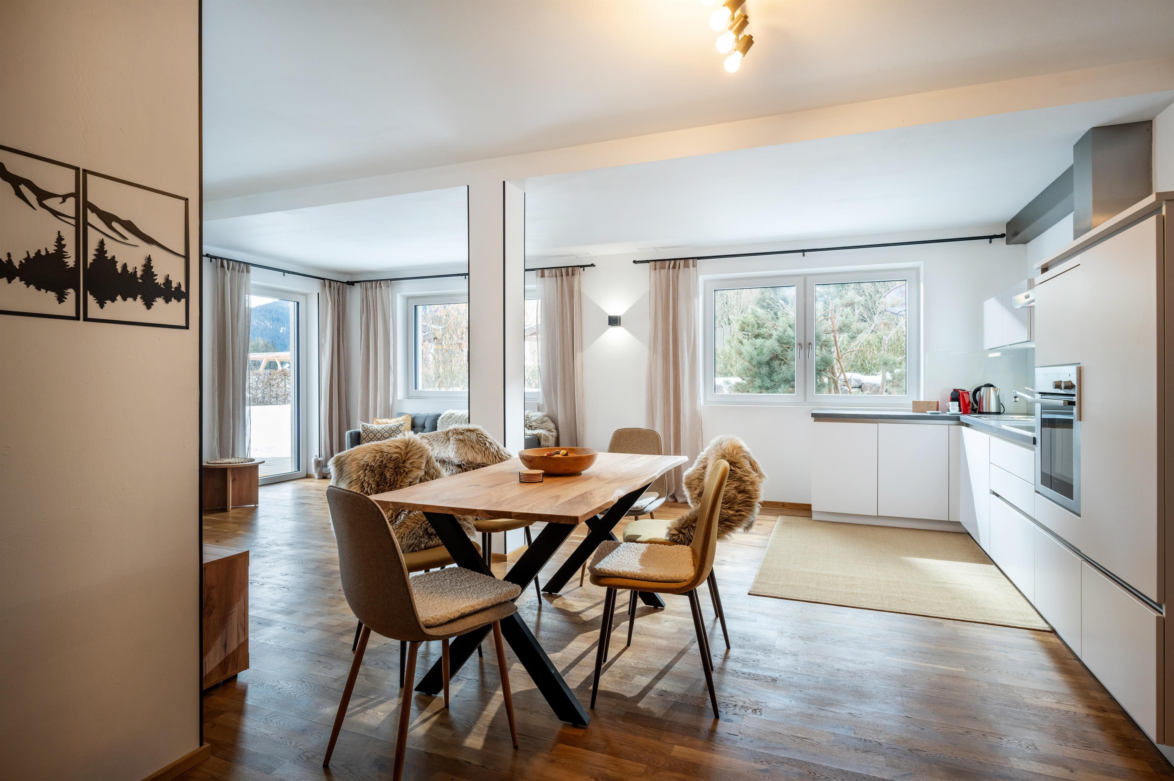 Der offene Wohnraum mit integrierter Küche lädt zum gemeinsamen Verweilen ein. Die Küche ist vollständig ausgestattet mit Spülmaschine, Kühlschrank und Backrohr. Im Wohnbereich steht ein TV zur Verfügung.