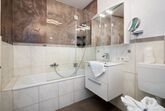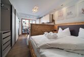 Die Ferienwohnung verfügt über 1 Schlafzimmer und eine Küchenzeile mit einem Kühlschrank, einem Geschirrspüler sowie einer Kaffeemaschine.