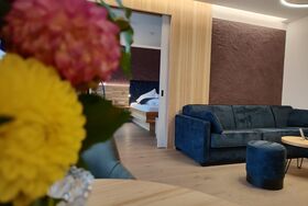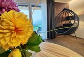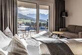 Unsere neuen Suiten im Haupthaus vereinen auf 50 bis 60 m² stilvolle Eleganz und alpinen Flair. Die weitläufigen Panoramafenster eröffnen einen eindrucksvollen Blick auf die majestätische Bergwelt und lassen die Natur zum ständigen Begleiter Ihres Aufenthalts werden. Diesen herrlichen Ausblick können Sie auch vom gemütlichen Balkon aus genießen! Das separate Schlafzimmer mit komfortablem Doppelbett verspricht Ruhe und Erholung, während der großzügige Wohnbereich mit gemütlicher Sitzecke und einem exklusiven Hängesessel – dem stilvollen Mittelpunkt der Suite – zum Verweilen einlädt.