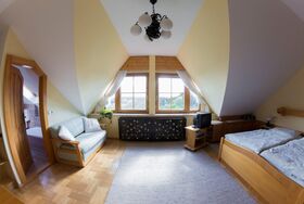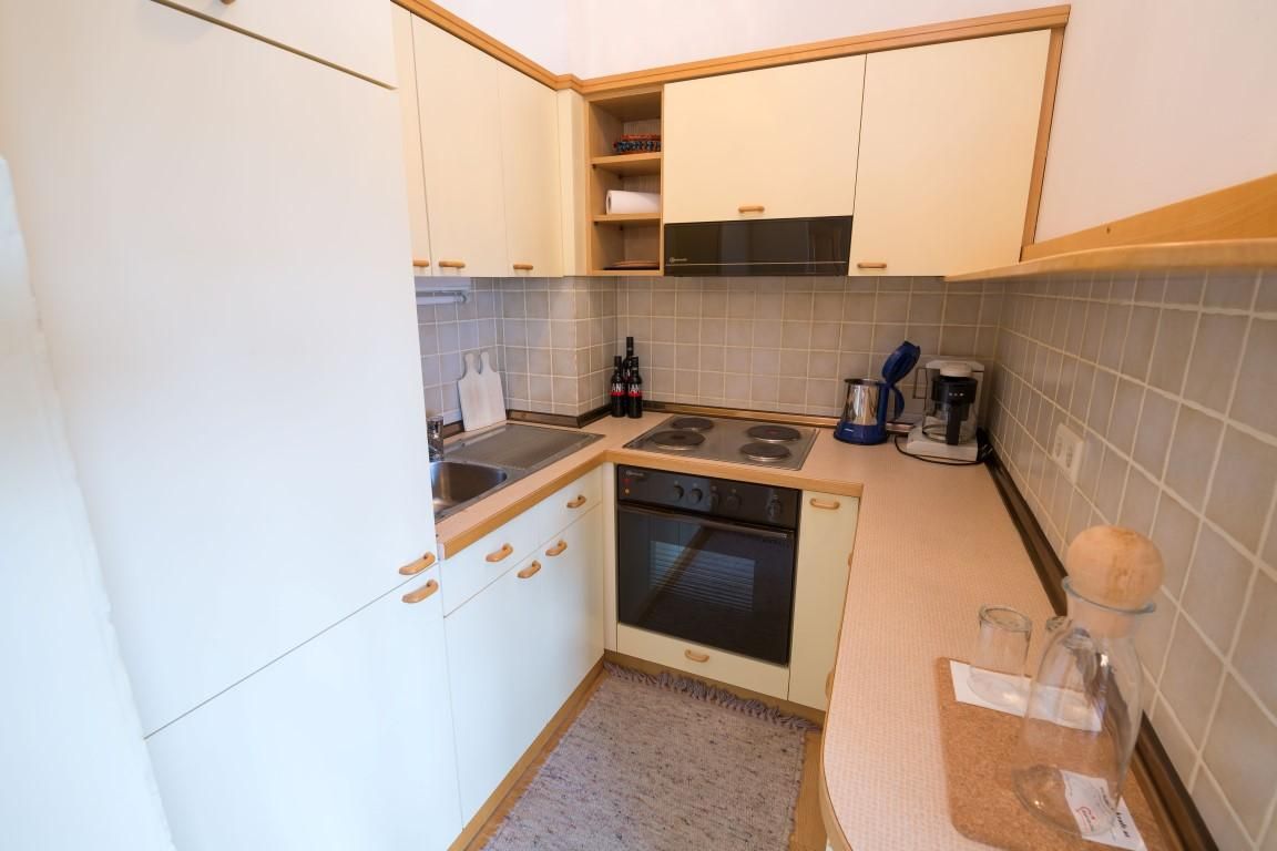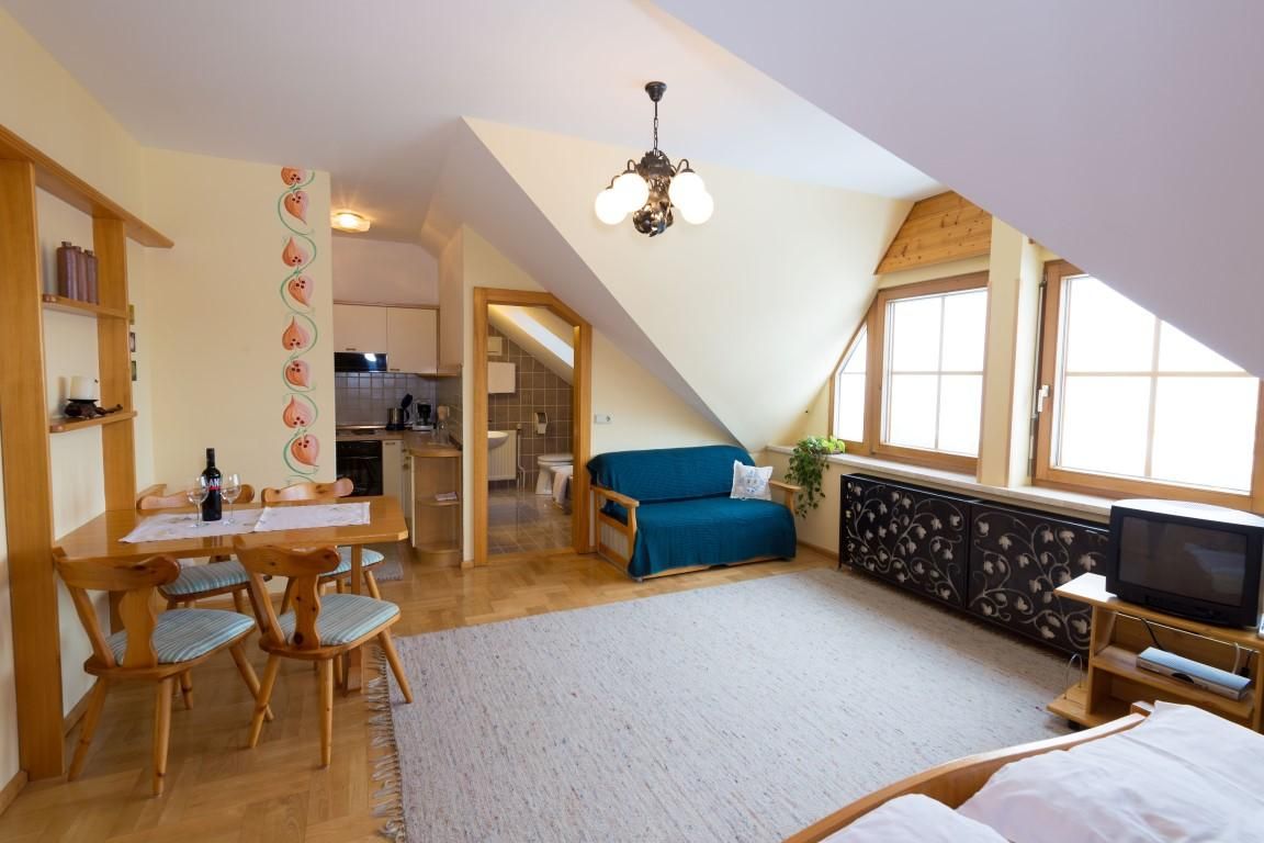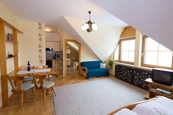 Unser Familienzimmer ist ca. 25 m2 groß und verfügt über einen eigenen Küchenblock, eine Essecke und eine ausziehbare Couch. Auch für ein Gitterbett bleibt noch genügend Platz!