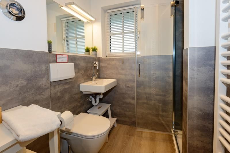 ein Bad mit Dusche/WC im Obergeschoss. Außerdem ein Schlafzimmer und TV,