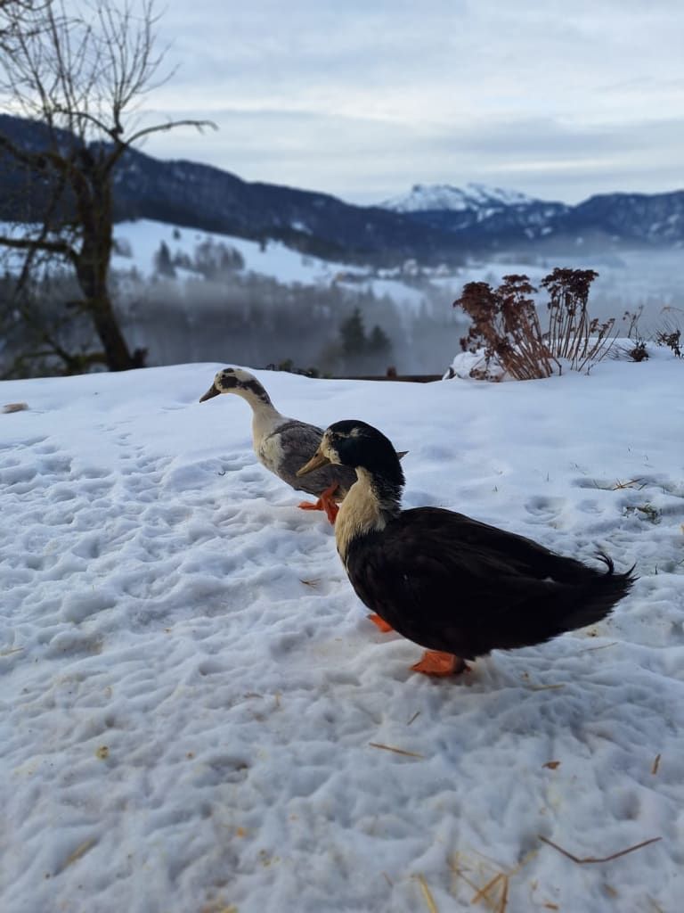 Während Kühe und Kälber den Sommer auf der Alpe verbringen, freuen sich unsere Enten, Hasen und die Ziege am Hof über Besuch und die eine oder andere Streicheleinheit.
