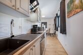 In der gut ausgestatteten Küche sind ein Kochfeld, ein Kühlschrank, Küchenutensilien und ein Backofen vorhanden.