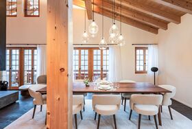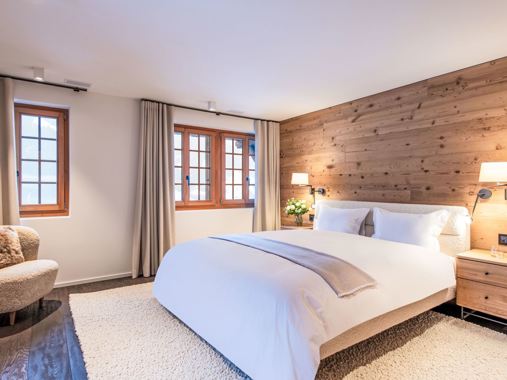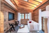 8-Zimmer-Chalet 405 m2 auf 3 Stockwerken. Luxuriös und stilvoll eingerichtet: 1 Zimmer mit 1 Doppelbett, Bad/Dusche/WC und Doppelwaschbecken. 1 Zimmer mit 1 Doppelbett, Bad/Dusche/WC und Doppelwaschbecken. 1 Zimmer mit 2 Betten und Dusche/WC. Bodenheizung. Unteres Geschoss: 1 Zimmer mit 1 Doppelbett. Bad/Dusche/WC, Doppelwaschbecken. Obergeschoss: grosses Wohnzimmer mit offenem Kamin, Esstisch und TV. Offene Küche (Backofen, Geschirrspüler, 4 Induktionskochplatten, Toaster, Wasserkocher, Mikrowelle, Tiefkühler, elektrische Kaffeemaschine) mit Esstisch. Sep. WC. Balkon 80 m2, Terrasse 30 m2. Balkonmöbel, Liegestühle (3). Sehr schöne Panoramasicht auf die Berge. Zur Verfügung: Waschmaschine, Wäschetrockner, Sauna, Haartrockner. Internet (WLAN, gratis). Bitte beachten: Nichtraucher-Haus.