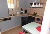 Die neue Küche mit Essecke beinhaltet neben einem Kühlschrank mit Gefrierfach, eine Spülmaschine und einen Herd mit Backofen.