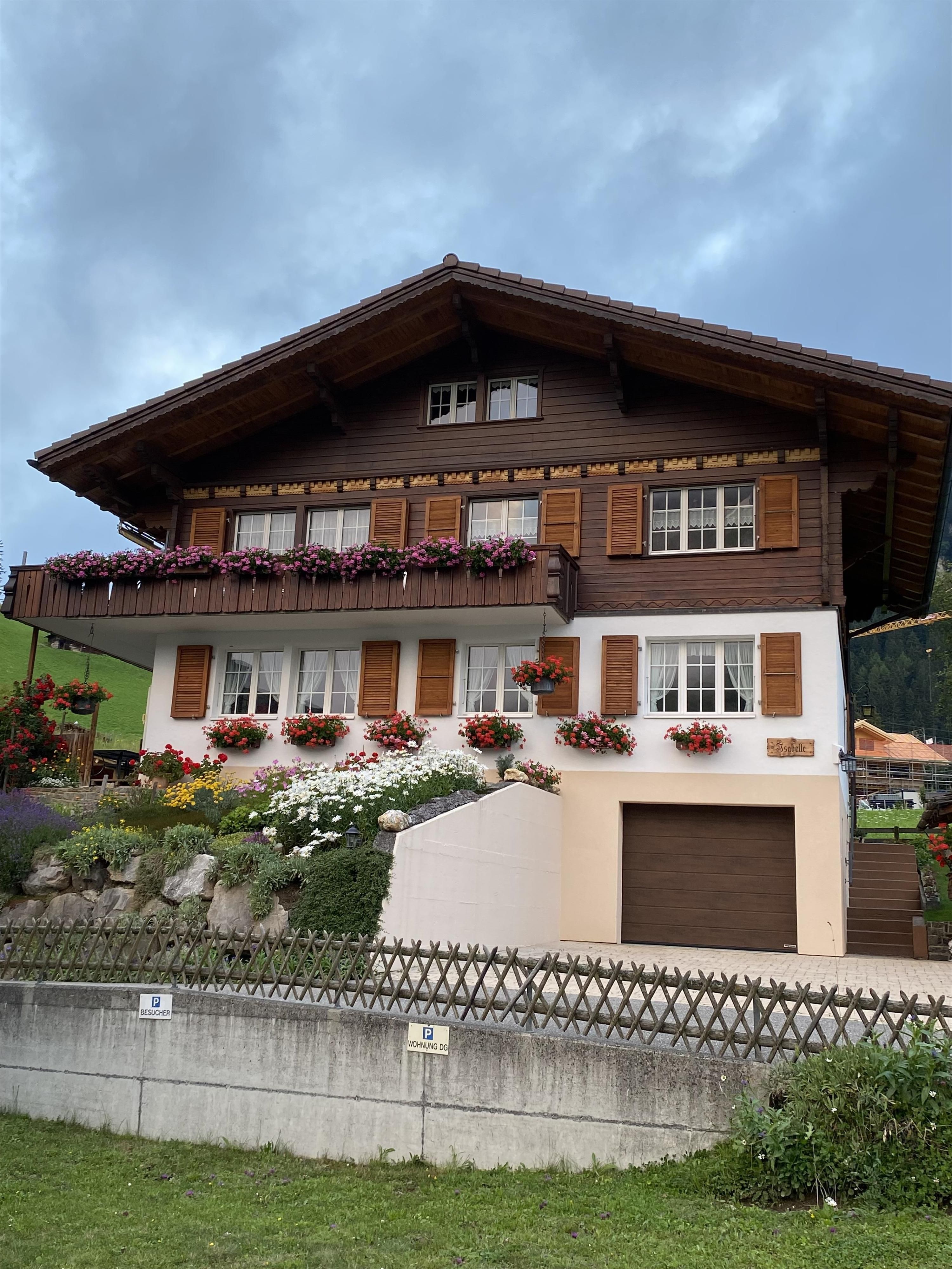 Die 4.5-Zimmerwohnung befindet sich im 1. Stock eines Zweifamilienhauses und verfügt über eine kleine Terrasse (ca. 14 m²). Das Chalet ist wunderbar gelegen und bietet einen einmaligen Blick auf die legendäre Weltcuppiste sowie auf Wildstrubel, Lohnermassiv und den imposanten Talabschluss.