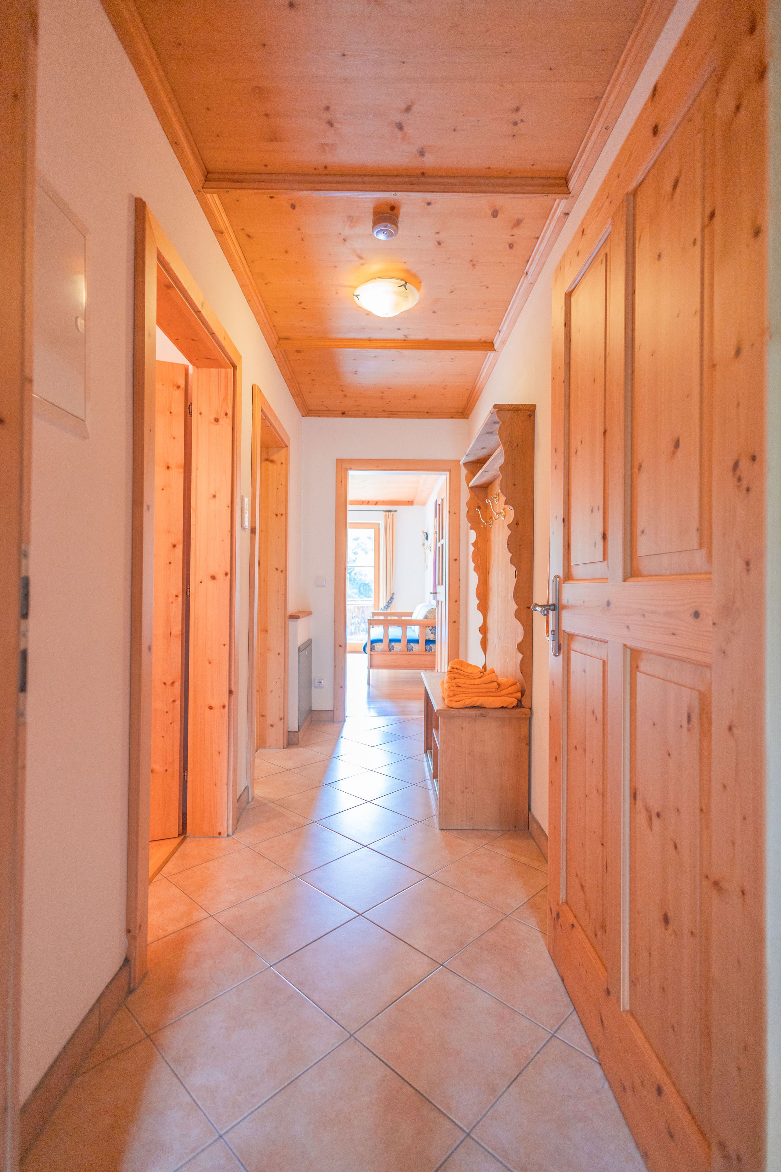Die Wohnung verfügt über 2 Zimmer, darunter ein gemütliches Schlafzimmer mit einem bequemen Doppelbett. Die Einrichtung ist durch Holzmöbel geprägt, die eine warme und einladende Atmosphäre schaffen.