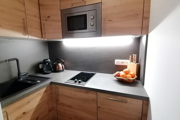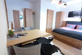 Das Studioapartment #1 im Erdgeschoss bietet auf 20 m² Platz für bis zu 3 Personen. Es verfügt über ein Doppelbett sowie ein Schlafsofa als zusätzliche Schlafgelegenheit. Die Kitchenette ist mit Geschirrspüler, Mikrowelle, 2‑Platten‑Cerankochfeld, Wasserkocher, Tassimo-Kaffeemaschine, kleiner Kaffee- und Teeaustwahl, Kontaktgrill, Geschirr und Reinigungsutensilien ausgestattet. WLAN und ein Flachbild-TV über Kabel stehen ebenfalls zur Verfügung. Das Badezimmer verfügt über Dusche, WC, Haartrockner, Hand- und Badetücher, Handseife und Toilettenpapier.