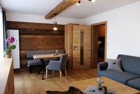 Die Ferienwohnung Top 4 mit Balkon befindet sich im ersten Stock des Nebengebäudes, direkt hinter dem Hauptgebäude, und bietet auf 38 m² Platz für bis zu 4 Personen. Sie verfügt über ein Schlafzimmer mit Doppelbett sowie eine Schlafcouch im Wohnbereich für 2 Personen. Das großzügige Wohnzimmer bietet eine Sitzecke, einen Essbereich, Flachbild-TV und eine voll ausgestattete Küche. Das Badezimmer ist mit Dusche und WC ausgestattet.