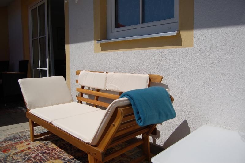Polyrattansitzgruppe, einer zum Liegebett verwandelbaren Holzbank, 2