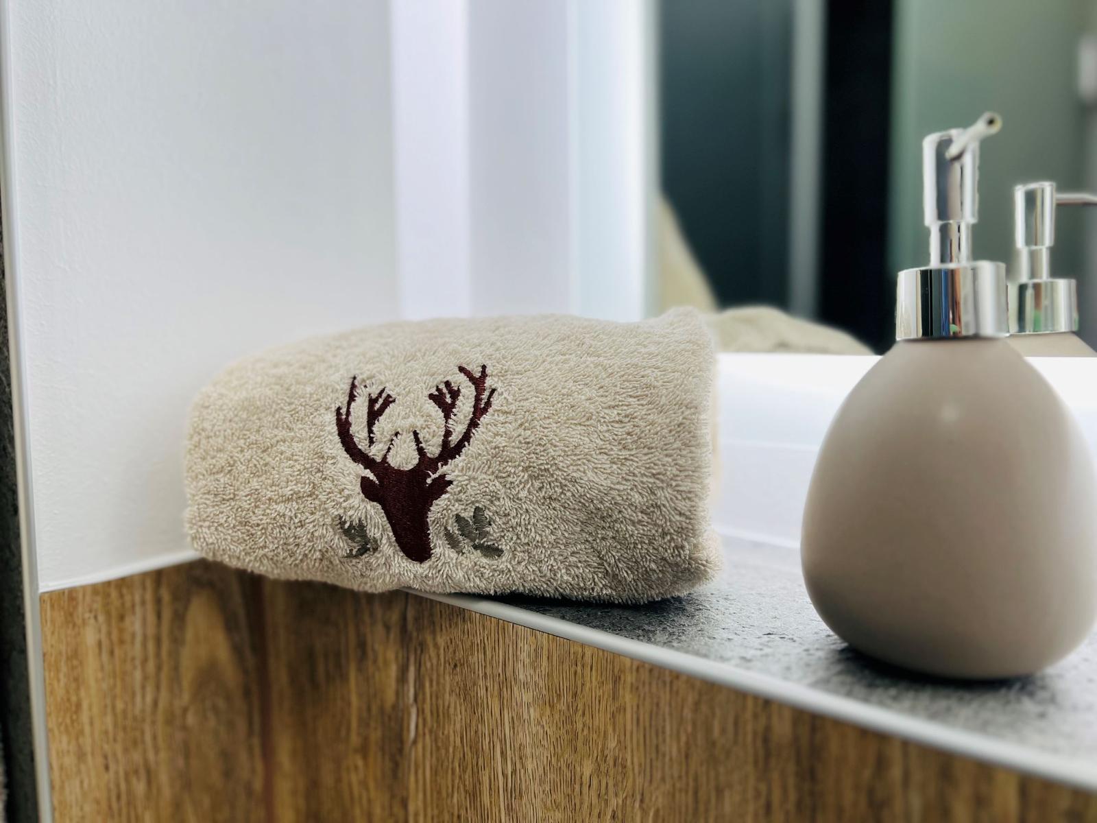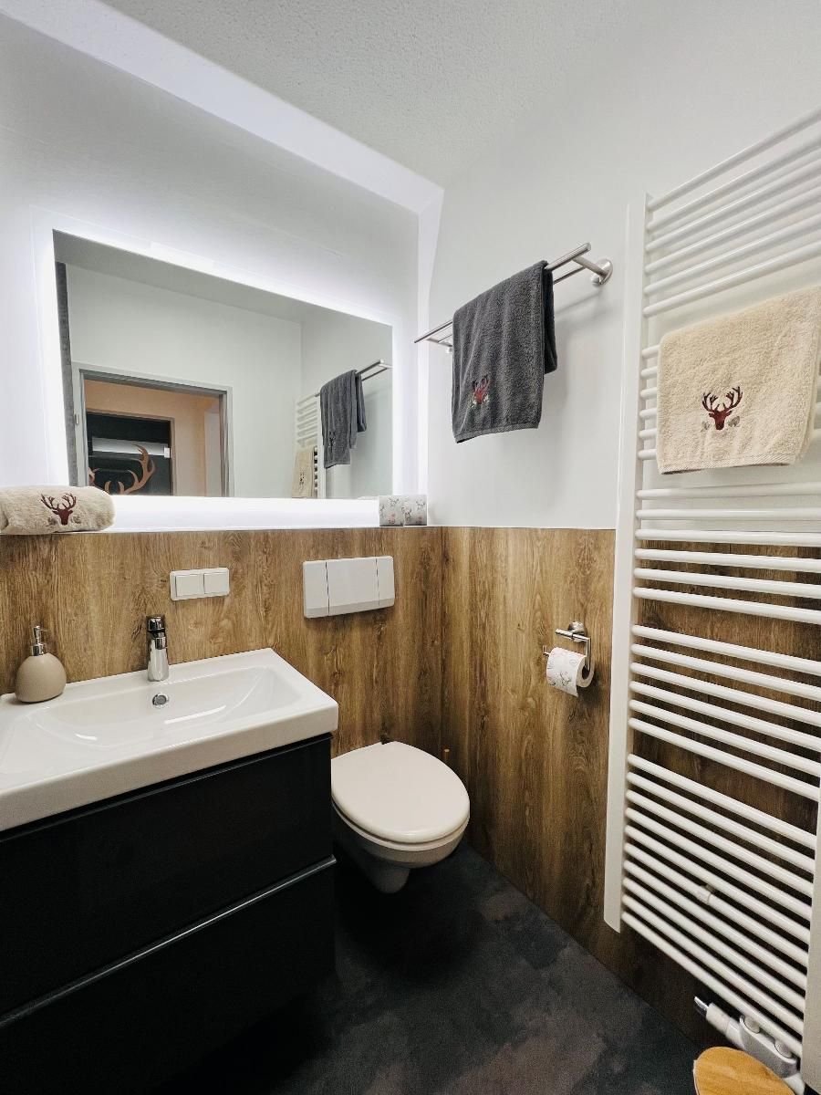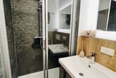 Das renovierte Badezimmer ist mit Regendusche und Thermostatbatterie ausgestattet.  Es verfügt über einen großen Wandspiegel mit Schminkspiegel und einem Fön. Das in der Wand integrierte Radio rundet den Badezimmeraufenthalt ab.