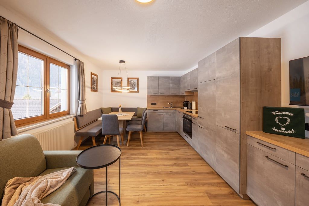 Ein Schlafzimmer mit Couch, eine Ausziehcouch im Wohnzimmer und ein Badezimmer mit separatem WC sorgen für den extra Komfort für bis zu 5 Personen. Genieße den Sonnenuntergang und die exklusive Aussicht auf die Berglandschaft auf dem geräumigen Balkon.