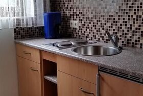 • mit Spüle, 2er Kochplatte und Kühlschrank, Geschirr, Kaffeemaschiene usw.