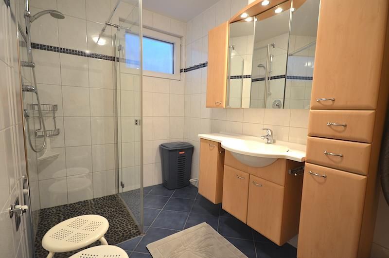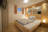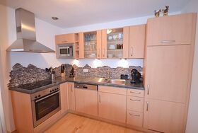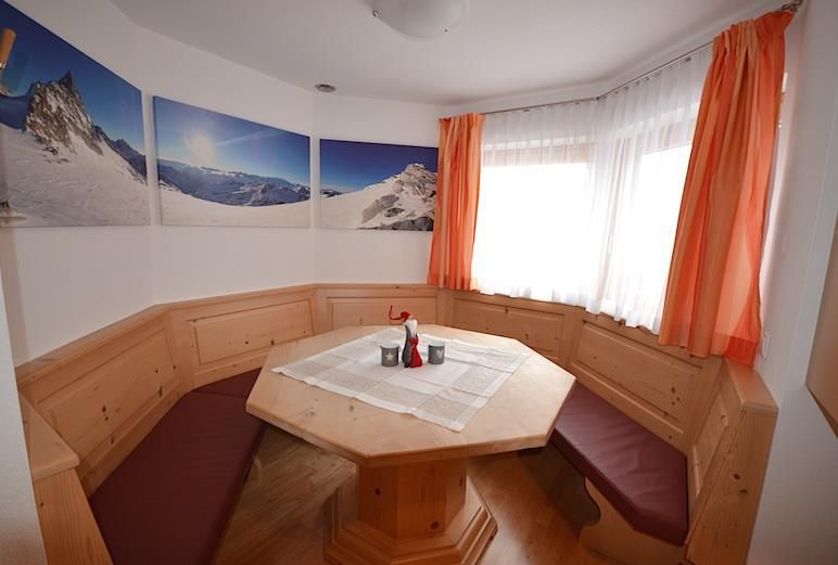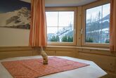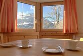 43m² Apartment im Parterre mit eigenem Eingang. 1 Schlafzimmer, Bad mit Dusche/WC, Wohnzimmer mit ausziehbarer Schlafcouch, Flat-Screen, komplett ausgestattete Küche, großer Esstisch im Erker, Sonnenterrasse mit Bergpanorama. Zugang nur über Treppe.