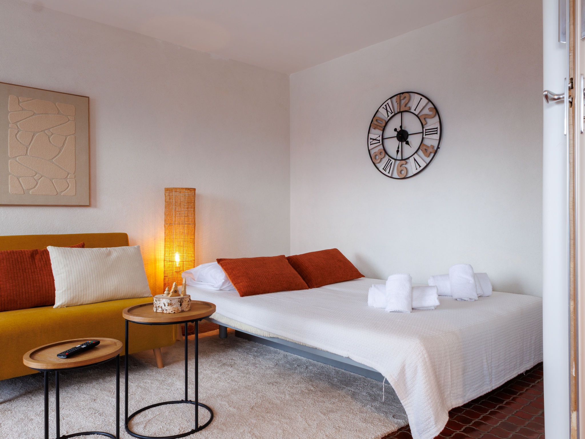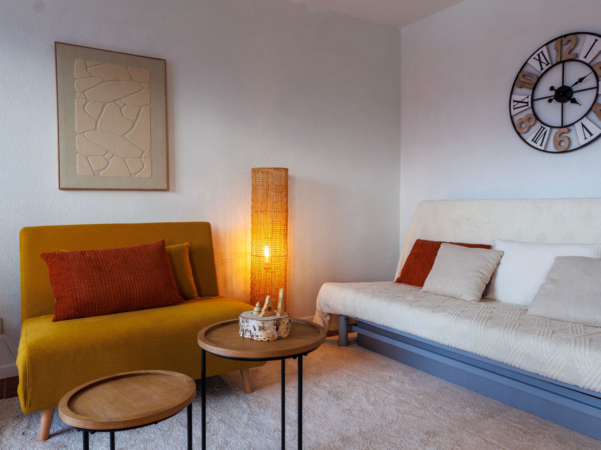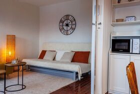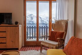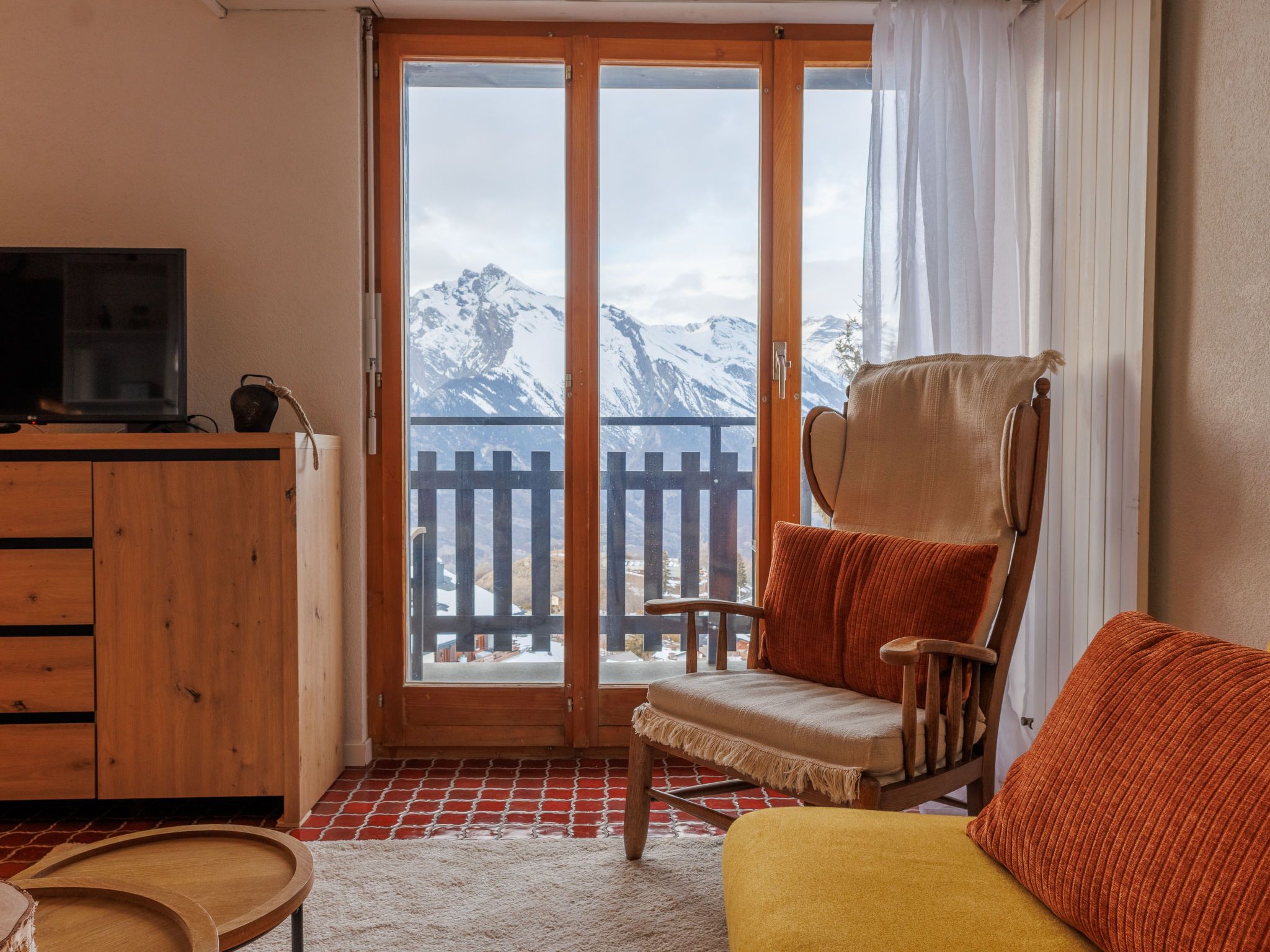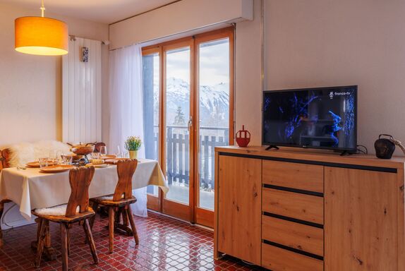 Jolimont J4, 1-Zimmer-Wohnung im 4. Stock, Nordlage. Objekt geeignet für 2 Erwachsene + 2 Kinder. Zweckmässig und schön eingerichtet: Eingang mit 1 x 2 Etagenbetten. Wohn-/Esszimmer mit 1 Diwanbett und Kabel-TV. Ausgang zum Balkon. Offene Küche (3 Kochplatten, Backofen, Toaster, Wasserkocher, Mikrowelle, elektrische Kaffeemaschine). Dusche/WC. Balkon. Sehr schöne Sicht auf die Berge. Zur Verfügung: Internet (WLAN, gratis). Bitte beachten: Nichtraucher-Unterkunft. Anstelle eines abgeschlossenen Schlafzimmers befinden sich manche Schlafplätze in einem offenen Bereich (Galerie, Nische etc.).
