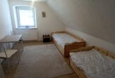 Schlafzimmer 3 im 1. Stock mit 2 Einzelbetten, Sessel und TV, großer Kleiderschrank