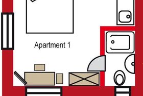 Es handelt sich hierbei um unser kleinstes Zimmer mit Doppelbett, Teeküche, Kühlschrank, Sitzgelegenheit mit Tisch für 2 Personen, WC/Dusche und TV.