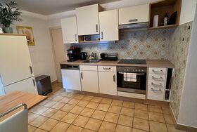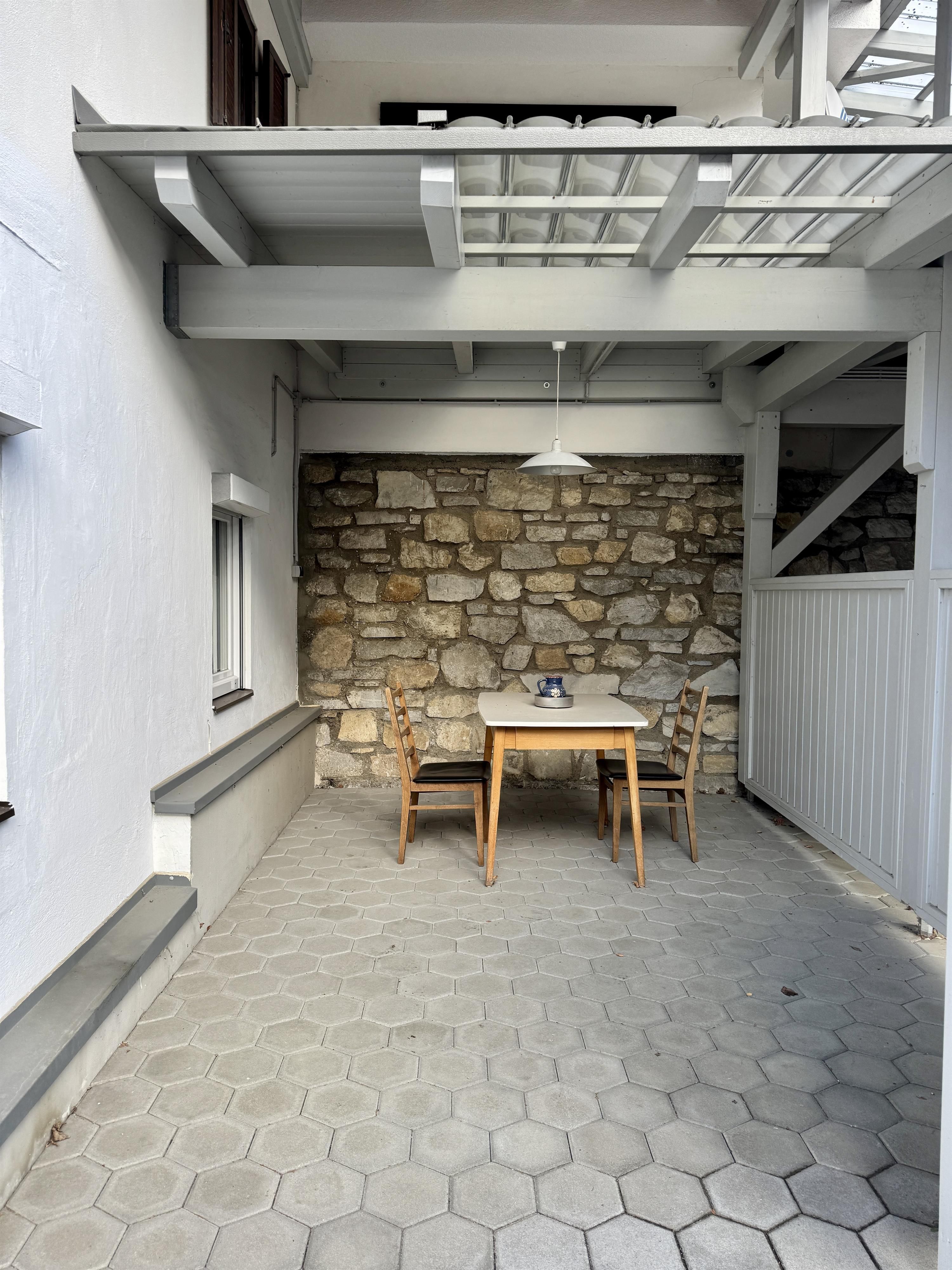Zur Ausstattung gehören WLAN, TV, Geschirrspüler, Kaffeemaschine, Wasserkocher sowie ein eigener Parkplatz direkt beim Haus. Ein kleiner Außensitzbereich lädt zum Verweilen ein.