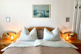 Schlafraum mit großem Doppelbett, TV - großer Badraum mit Dusche/WC