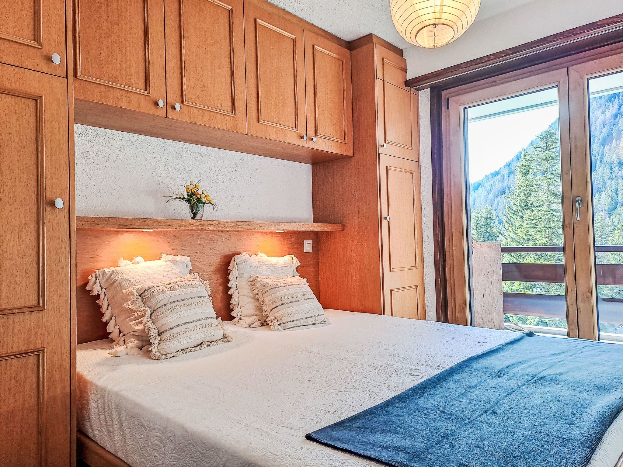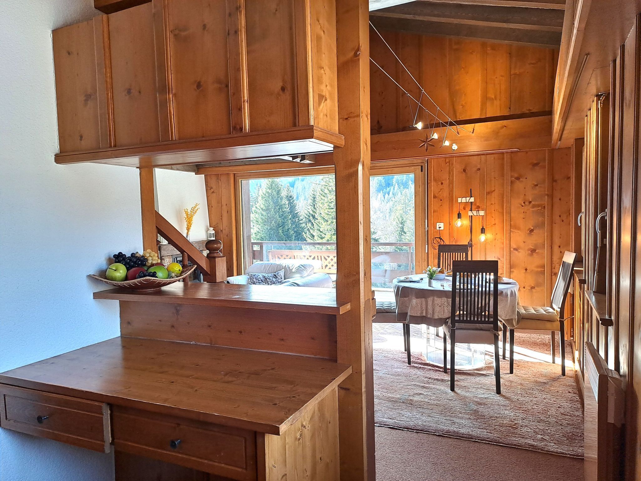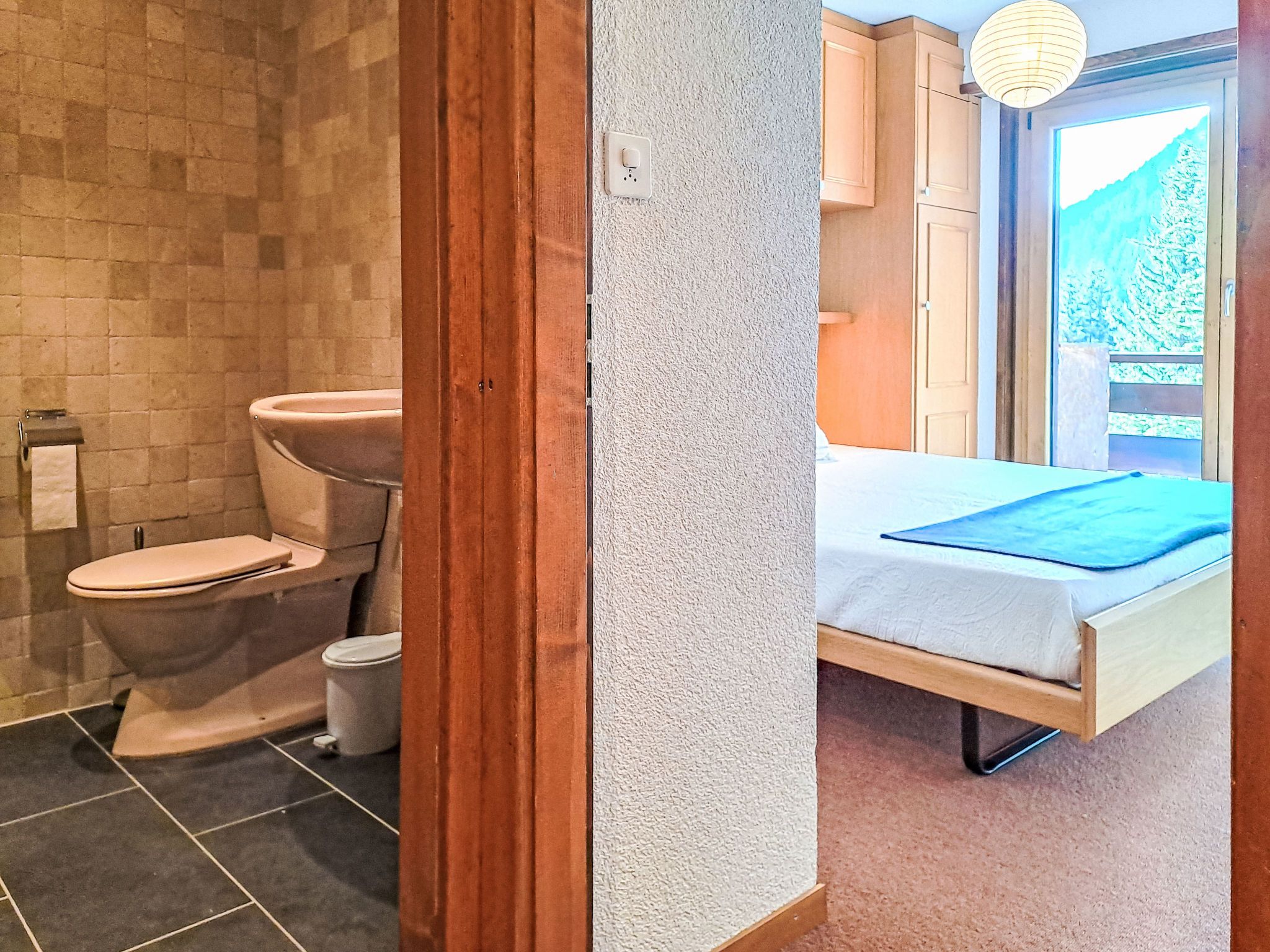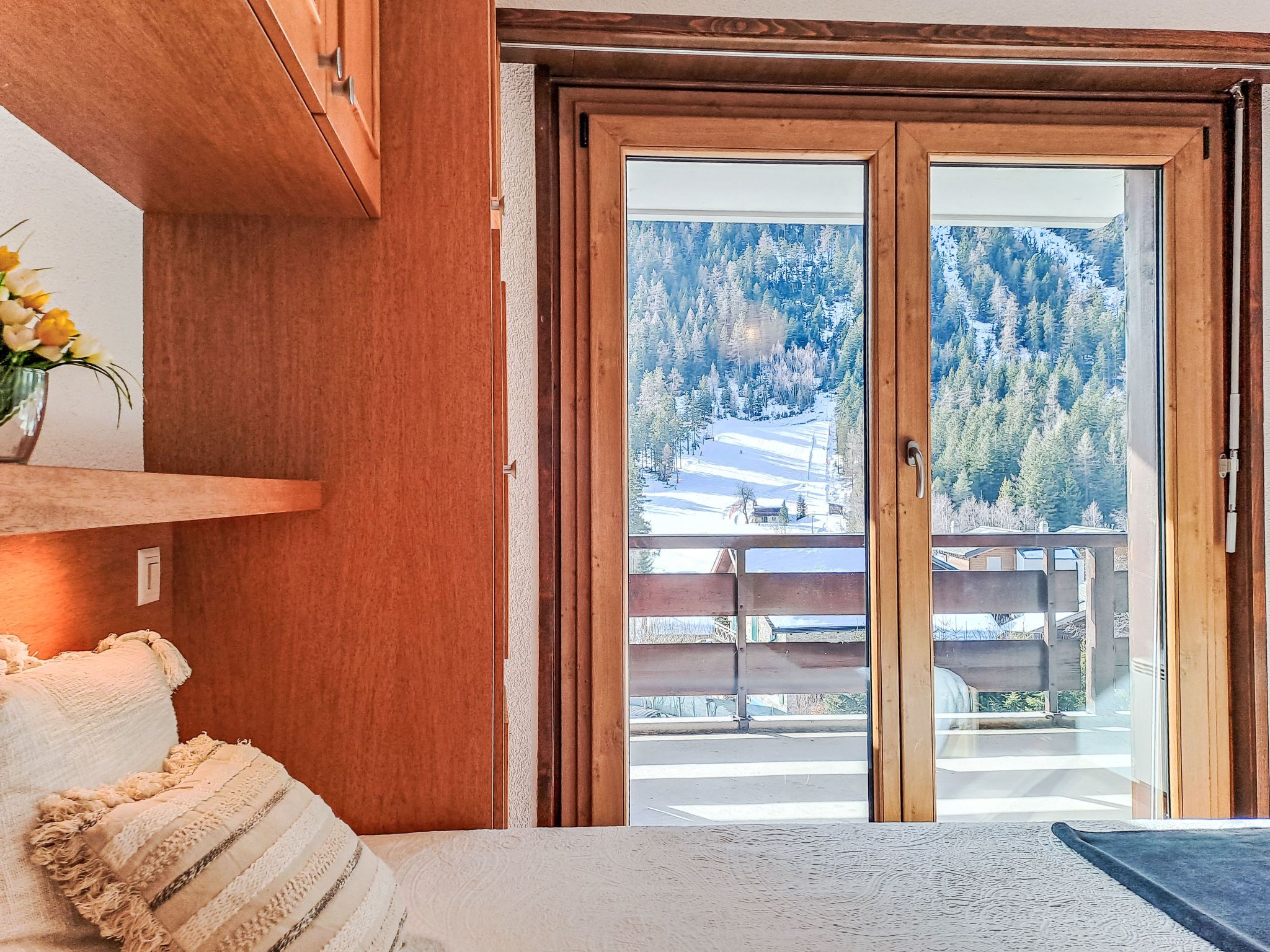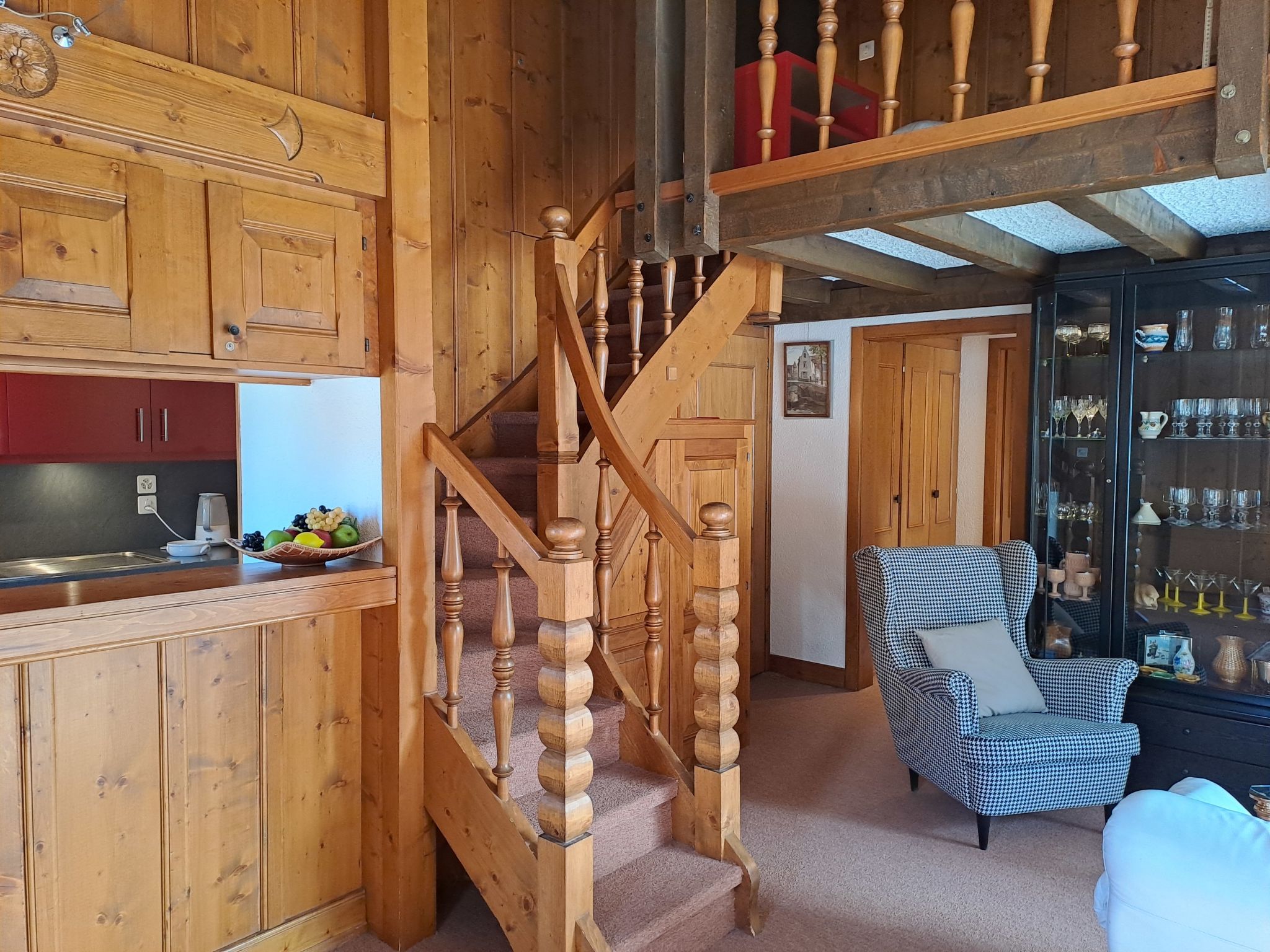 Sporting 317, 2-Zimmer-Wohnung 85 m2 im 3. Stock. Geräumig, abgeschrägt, komfortabel und schön eingerichtet: grosses Wohn-/Esszimmer mit offenem Kamin und TV. Ausgang zum Balkon. 1 grosses Zimmer mit 1 Bett (180 cm, Länge 200 cm). Offene Küche (Backofen, Geschirrspüler, 4 Glaskeramikplatten, Toaster, Wasserkocher, Mikrowelle, Tiefkühler, elektrische Kaffeemaschine, Racletteofen, Fondue Set (Käse)). Bad/WC. E-Heizung. Obergeschoss: (Wendeltreppe) abgeschrägte, offene Galerie mit 2 Betten (90 cm, Länge 190 cm). Teppichboden. Grosse Terrasse. Sehr schöne Sicht auf den See und die Berge. Parkplatz in 50 m.