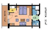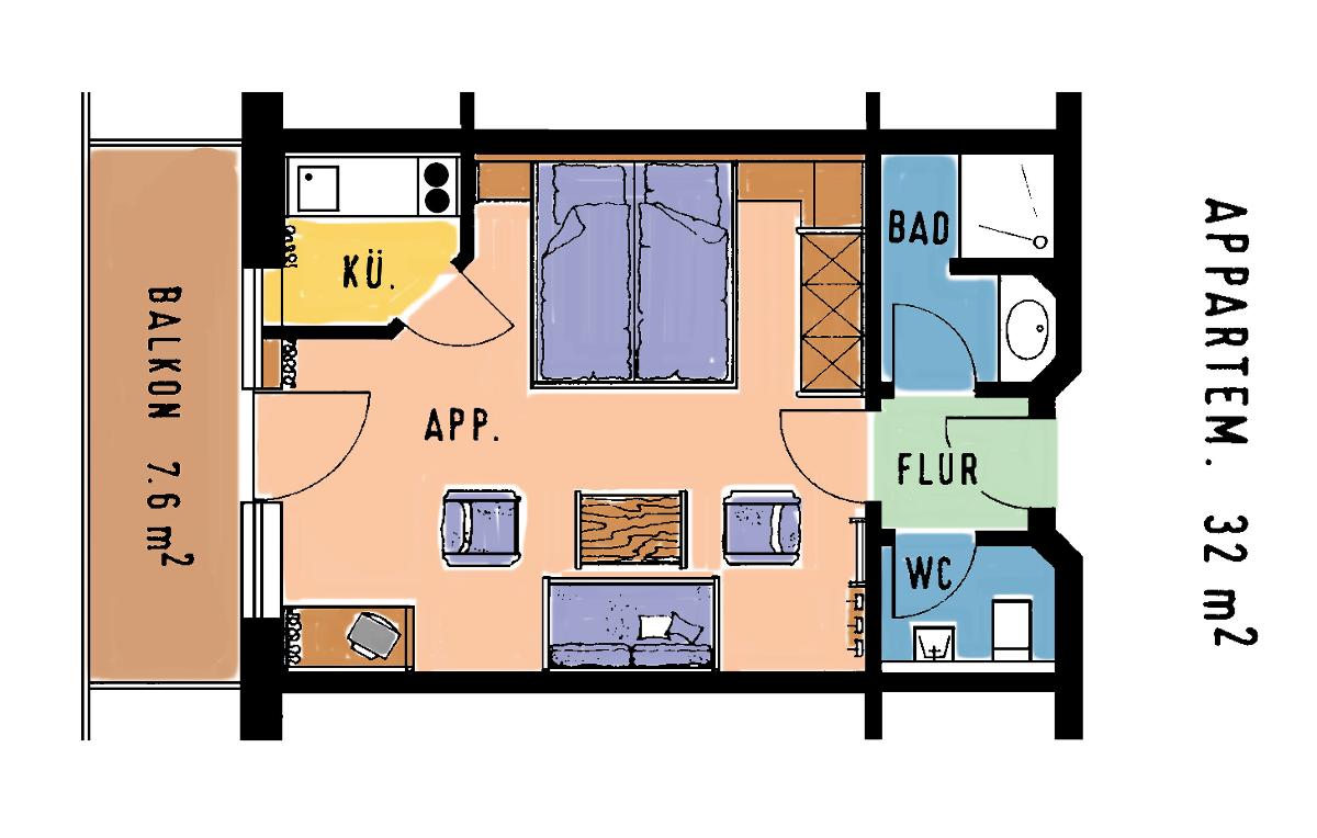 Einzimmerappartement mit 32m² (plus Balkon 7,6m²), mit feststehenden Betten, Massivmöbeln, komplett