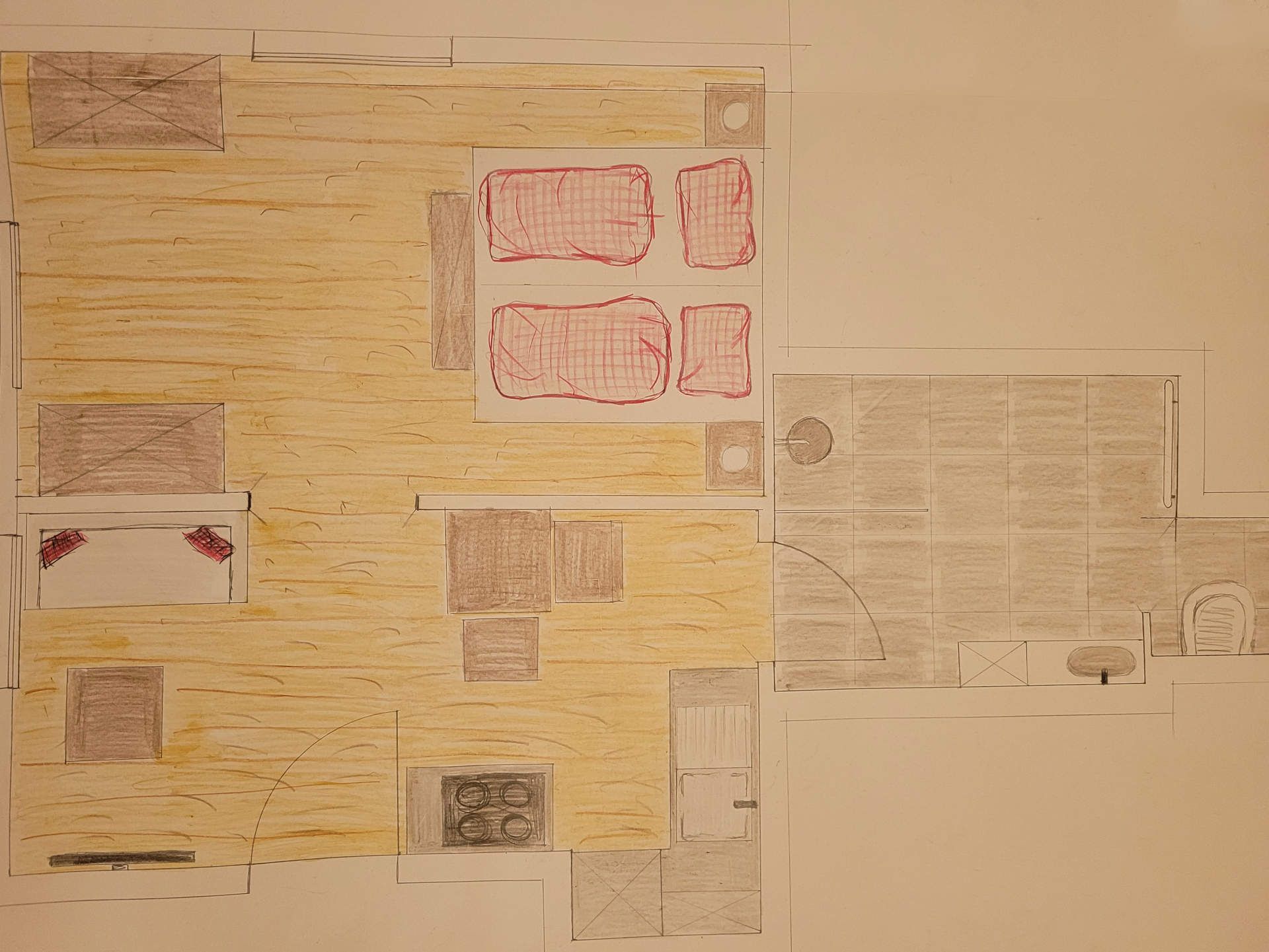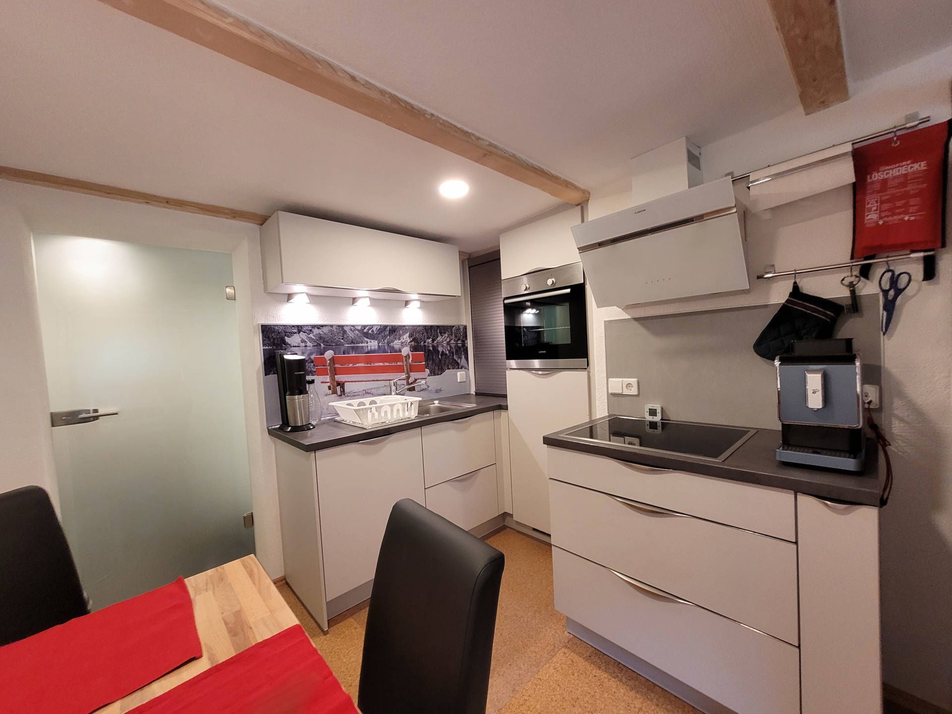 • Offener, heller Wohn- und Essbereich mit großzügig ausgestatteter Küche mit Backofen, Cerankochfeld mit Dunstabzug, Spülmaschine, Kaffee-Vollautomat, Soda-Stream, Toaster, Eierkocher, Handrührgerät, Pürierstab, Wasserkocher, Töpfe & Pfannen, Backformen, ausreichend (scharfe) Küchenmesser und andere Kochutensilien, Geschirr und diverse Gläser in ausreichender Menge