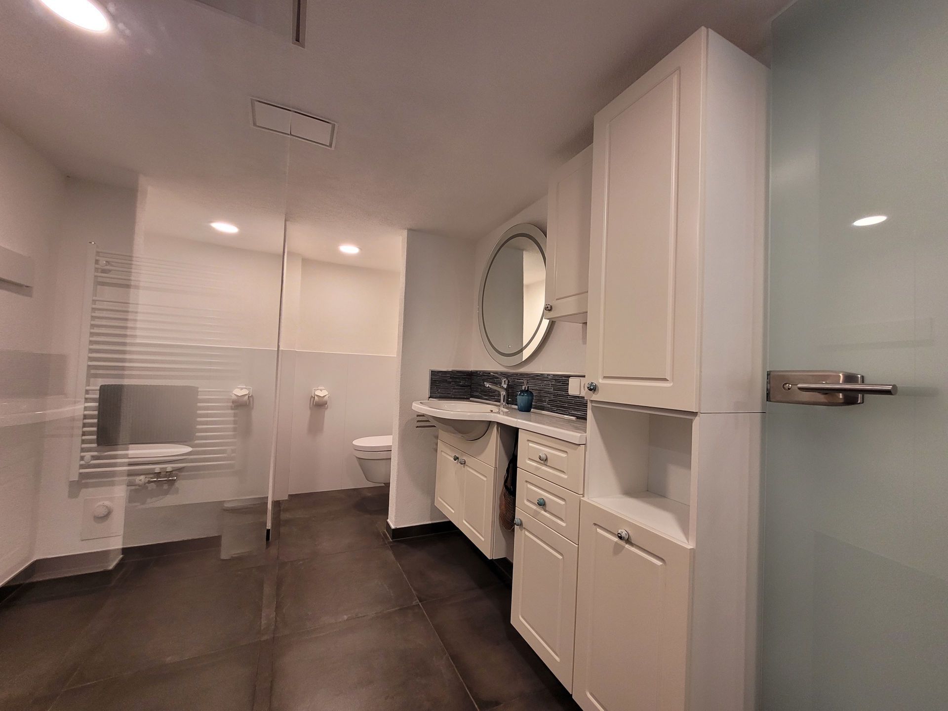 • Badezimmer mit großer begehbarer Regen-Dusche und Handbrause, Waschtisch und Handtuchtrockner