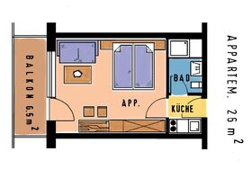 Appartementausstattung: Vollständig ausgestattete Kleinküche mit Kaffeemaschine; Dusche, WC, feststehende Betten mit Bandscheibenmatratzen, Farb-TV, Durchwahltelefon. Zu Ihrer Verfügung