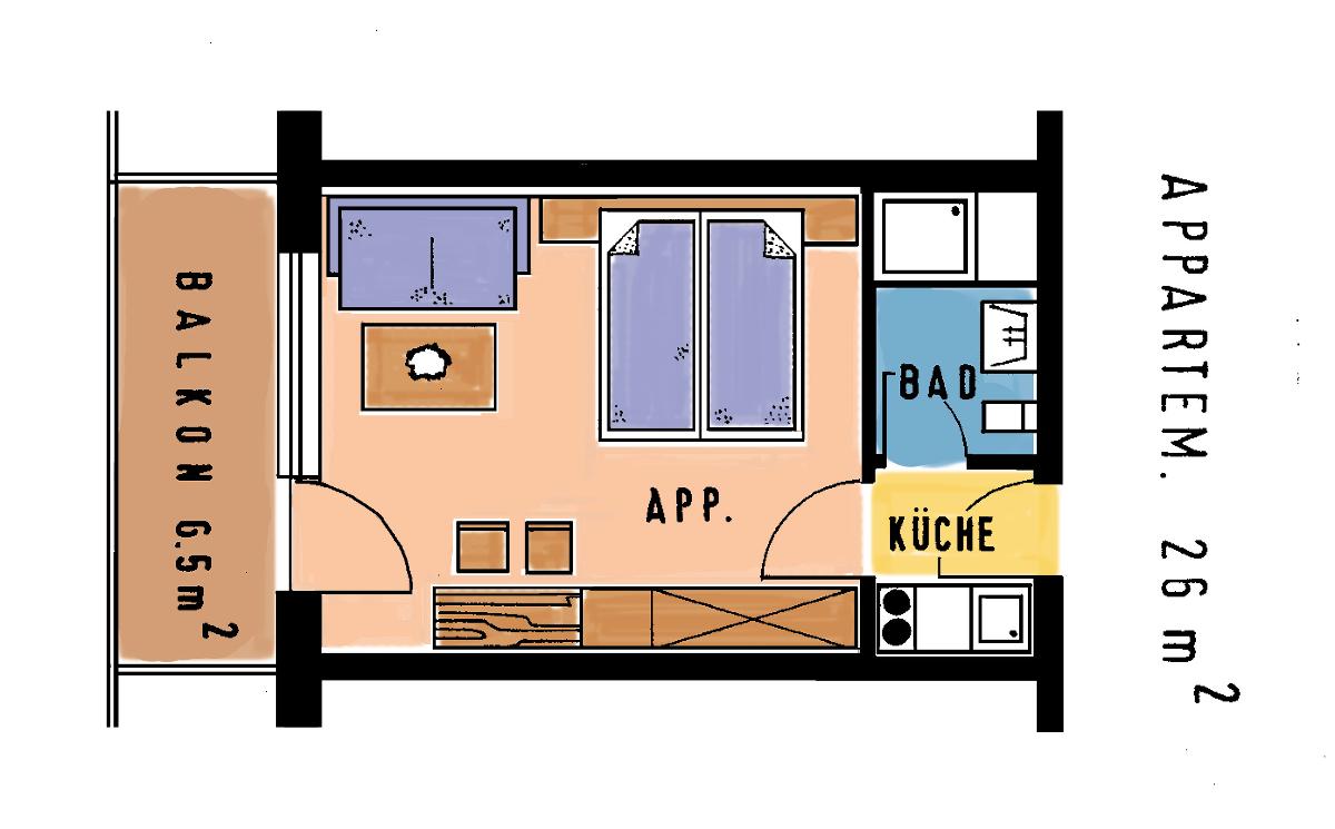 Einzimmerappartement mit 26m² (plus Balkon 6,5m²), mit feststehenden Betten, Massivmöbeln, komplett