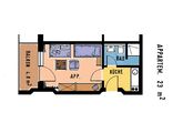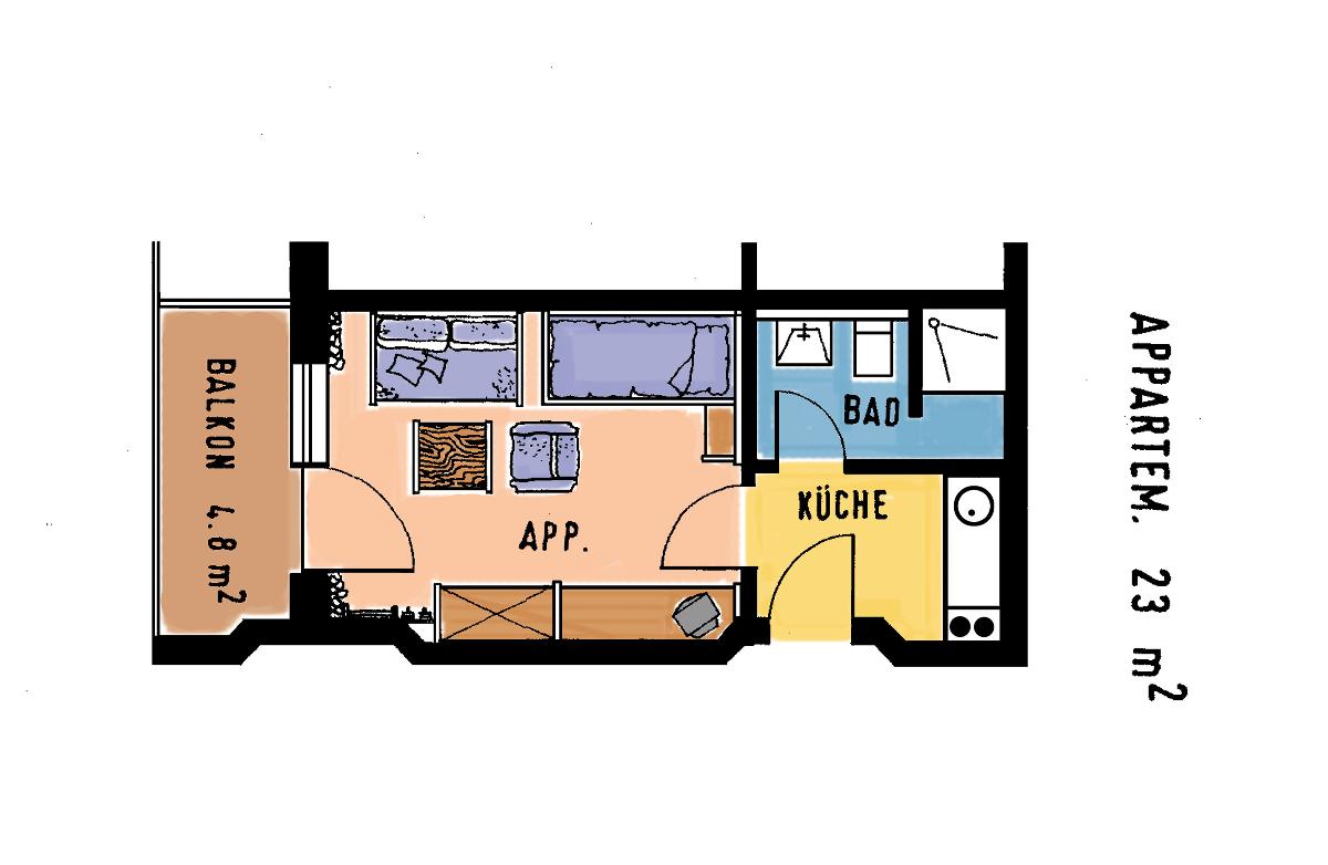 Einzimmerappartement mit 23m² (plus Balkon 4,8m²), mit feststehendem Bett, Massivmöbeln, komplett