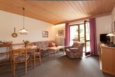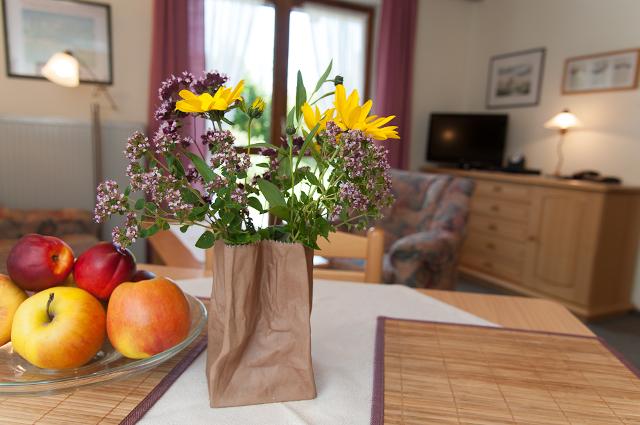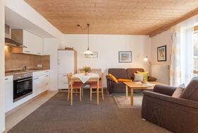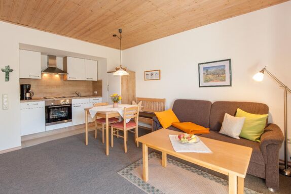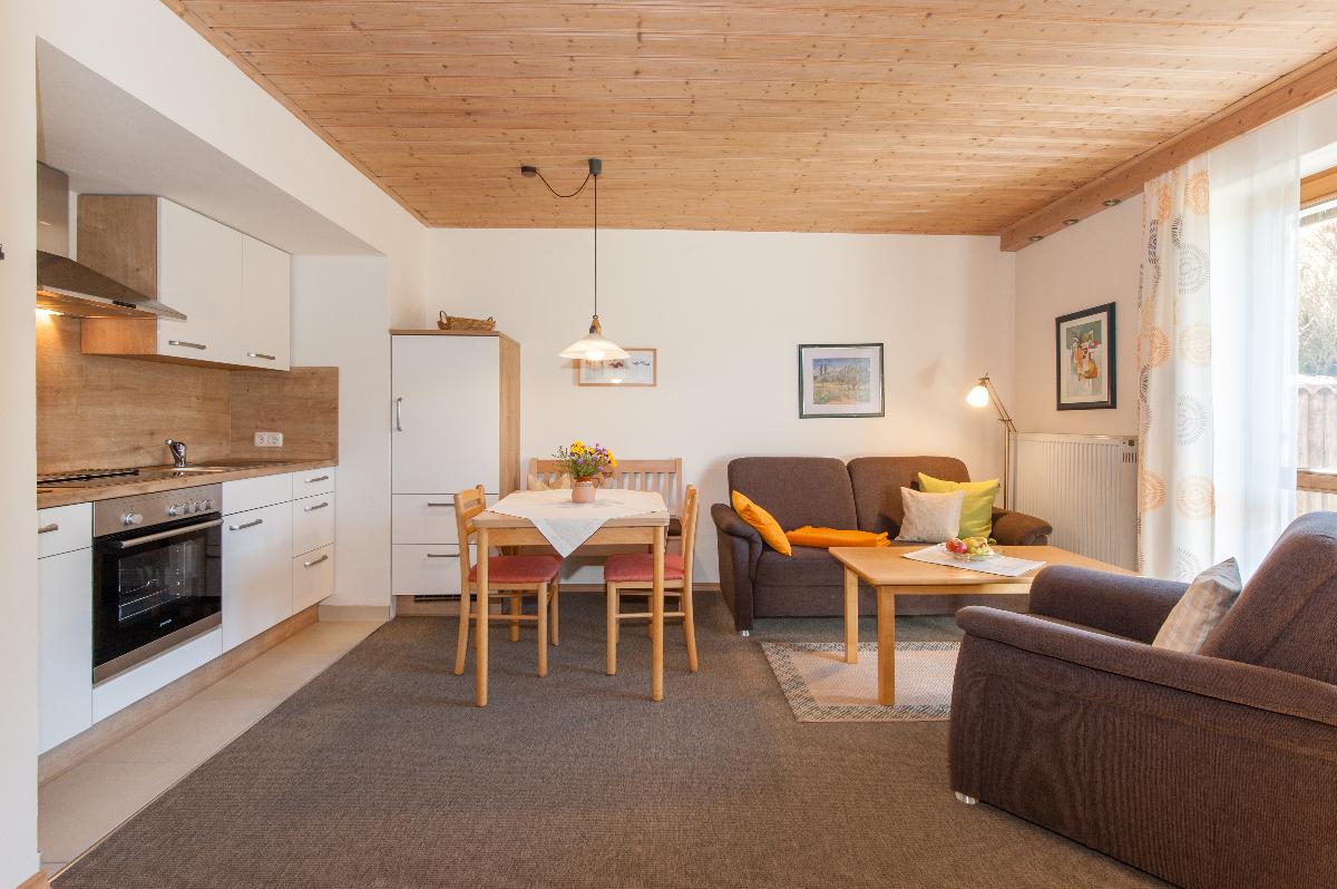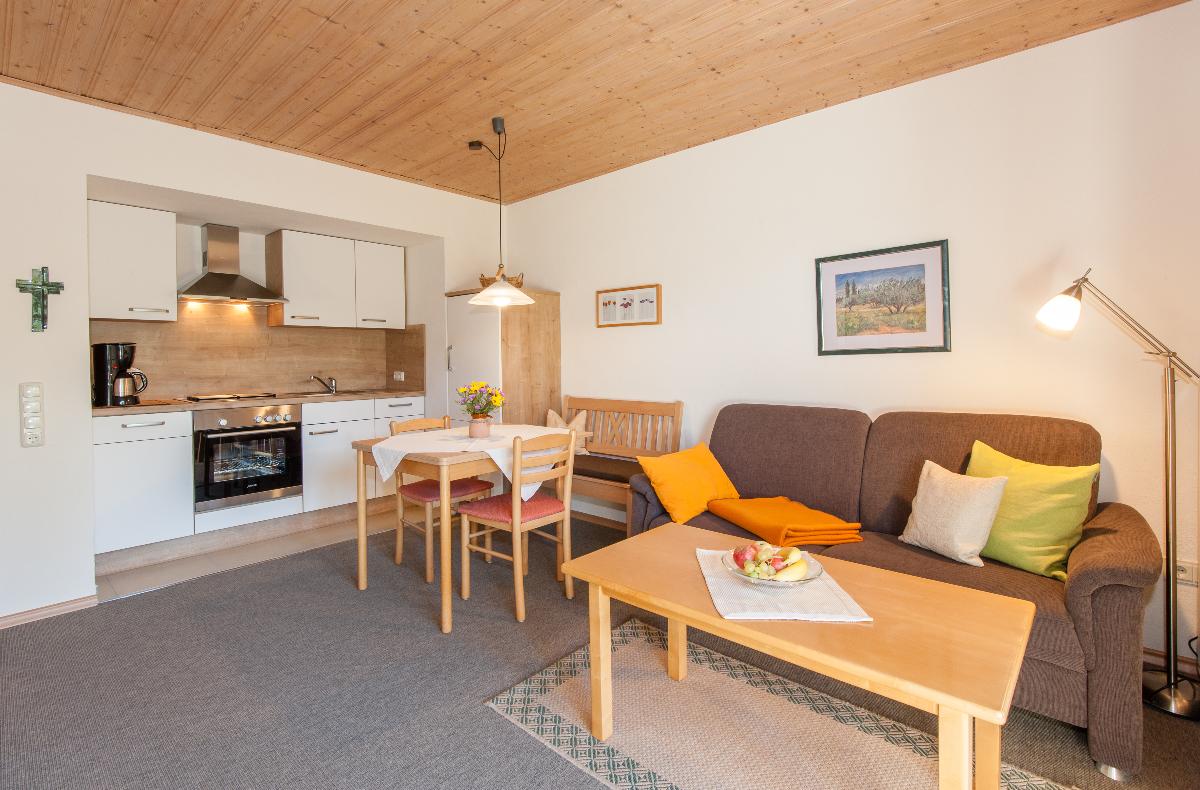 Für zwei Personen ist unsere Wohnung Sebastian die optimale Unterkunft. Die komplett ausgestattete Küchenzeile ist in den Wohnraum integriert und hat einen 4-Plattenherd mit Backofen und Spülmaschine.