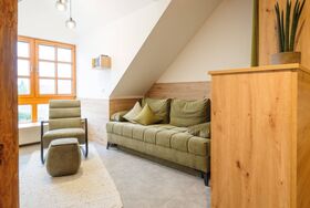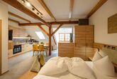 Das Apartment befindet sich im Dachgeschoss und bietet 36qm mit kombiniertem Wohn- und Schlafbereich. Das Doppelbett hat die Maße 180x200cm. Auf Wunsch lässt sich dieses auch teilen, sodass zwei Einzelbetten entstehen. Auf Anfrage ist eine Aufbettung für weitere Personen auf der Schlafcouch möglich. Diese lässt sich durch einen Vorhang etwas vom restlichen Wohnraum abtrennen. Selbstverständlich ist die Küchenzeile komplett ausgestattet: Kühlschrank, Backofen, Ceranfeld, Geschirrspülmaschine, Wasserkocher, Toaster, Kaffeemaschine und sämtliches Kochgeschirr sind vorhanden. Im Wohnraum befindet sich ein SMART-TV und ein Internetradio.