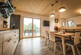 Das geräumige Holzferienhaus mit 99qm Wohnfläche verfügt über einen großzügigen Wohnraum mit abgetrennter Küchenzeile und Essecke, zwei Schlafzimmer, zwei Badezimmer, sowie ein separates WC.