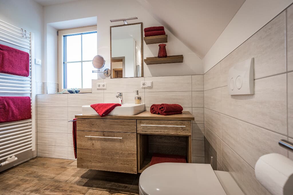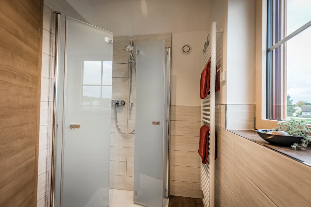 In den zwei identisch eingerichteten Badezimmern befinden sich Dusche, WC, Waschbecken und Handtuchheizkörper. Zusätzlich gibt es ein separates Gäste-WC im Erdgeschoss.