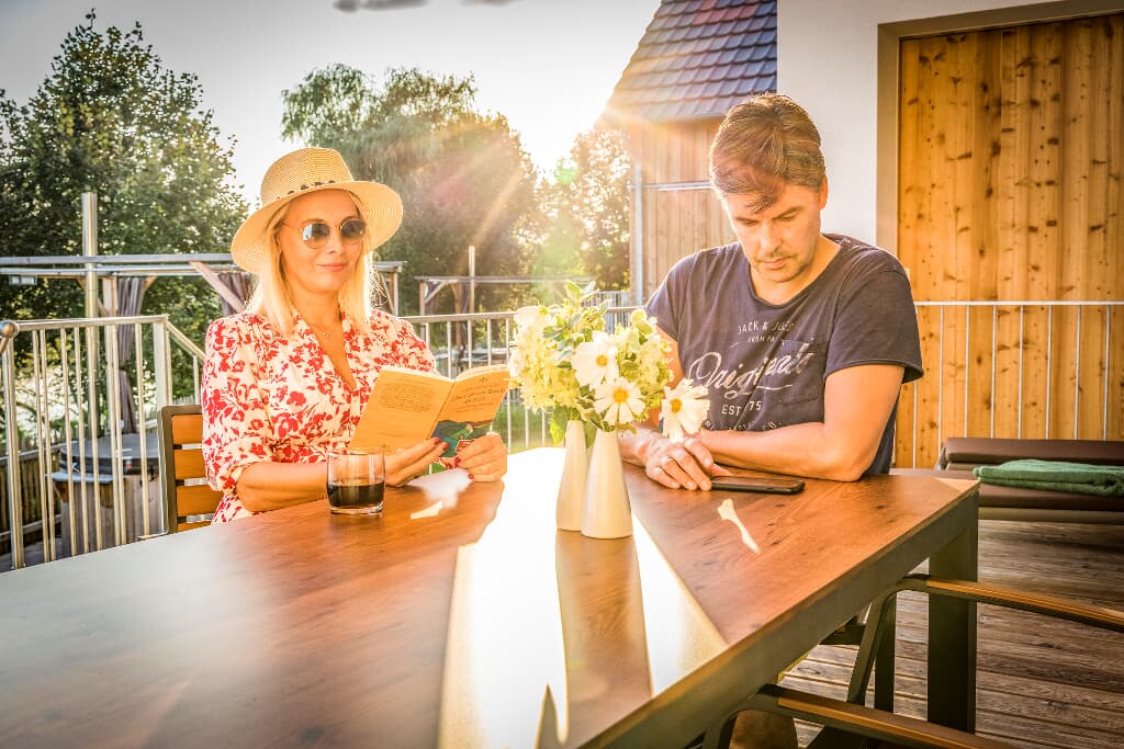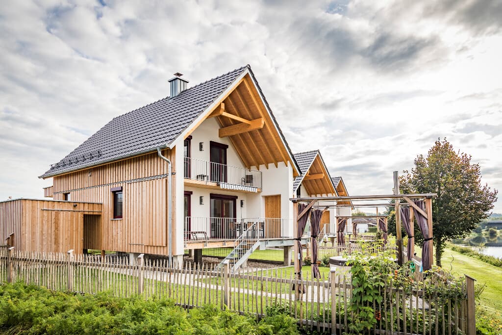 Übernachten Sie bei uns in Holzferienhäusern am Flussufer mit Kamin, großer Terrasse, Balkon, kleinem eingezäunten Garten und eigenem Hot Tub oder in einer von sieben gemütlichen Ferienwohnungen mit romantischem Kreuzgewölbe.