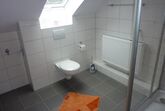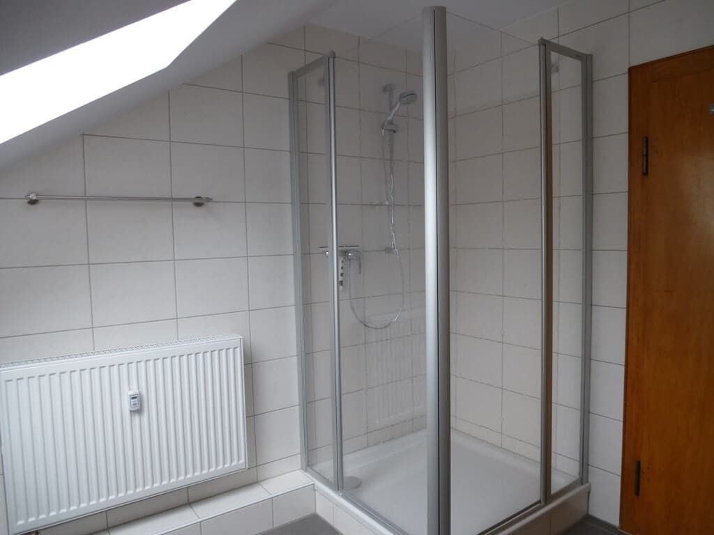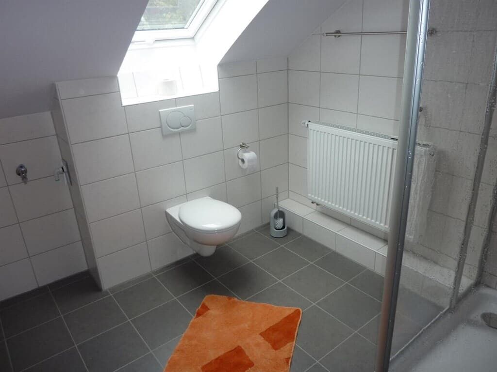 • Geräumiges Badezimmer mit Dusche (1 x 1 m), WC, Waschbecken und Fußbodenheizung.