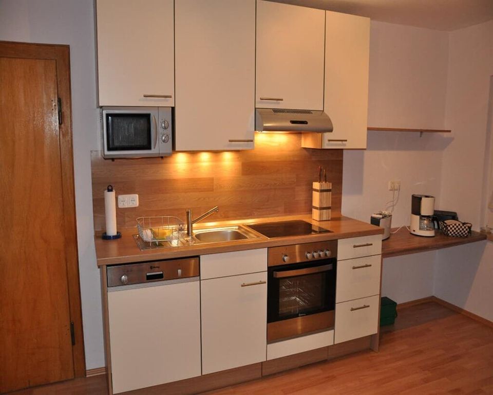 • Große und modern eingerichtete Wohnküche mit gemütlichem Essplatz und umfangreicher Ausstattung (Kaffeemaschine, Toaster, Spülmaschine, Mikrowelle, Backofen, Cerankochfeld, Kühl-/Gefrierkombination, komplettes Koch- und Essgeschirr.