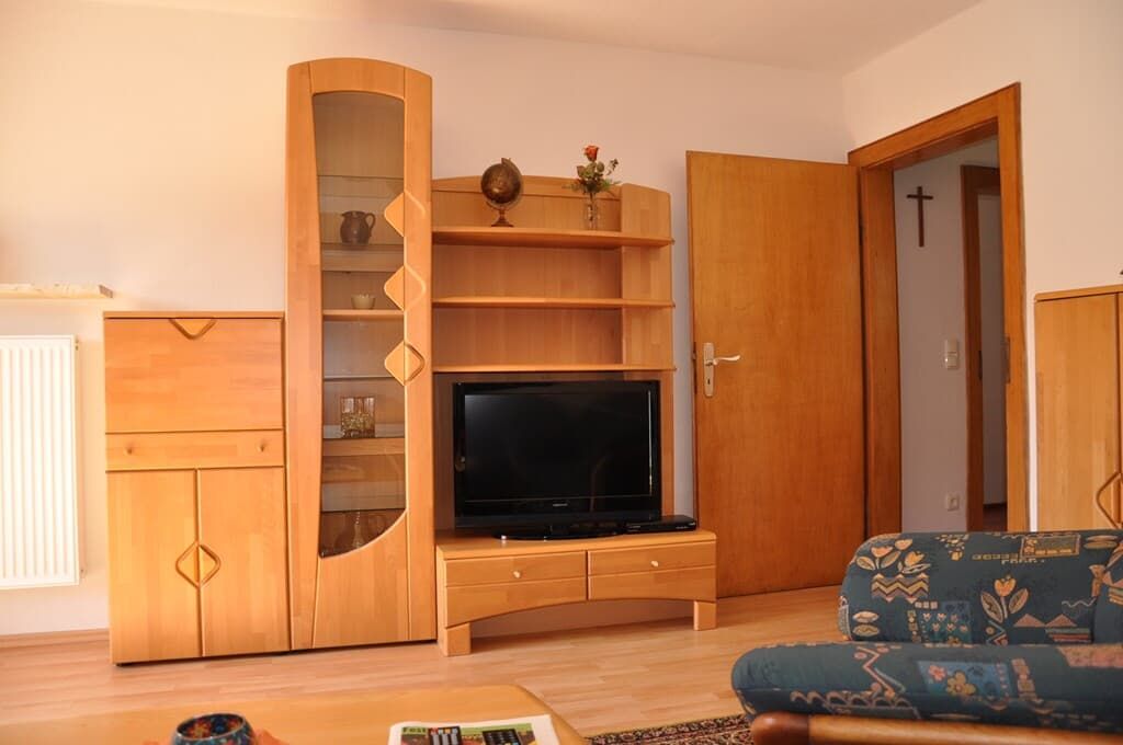 Unsere Wohnung für zwei Personen besteht aus einer Wohnküche, Wohnzimmer, Schlafzimmer und Bad mit Dusche und WC sowie einem Balkon mit Blick ins Regental.