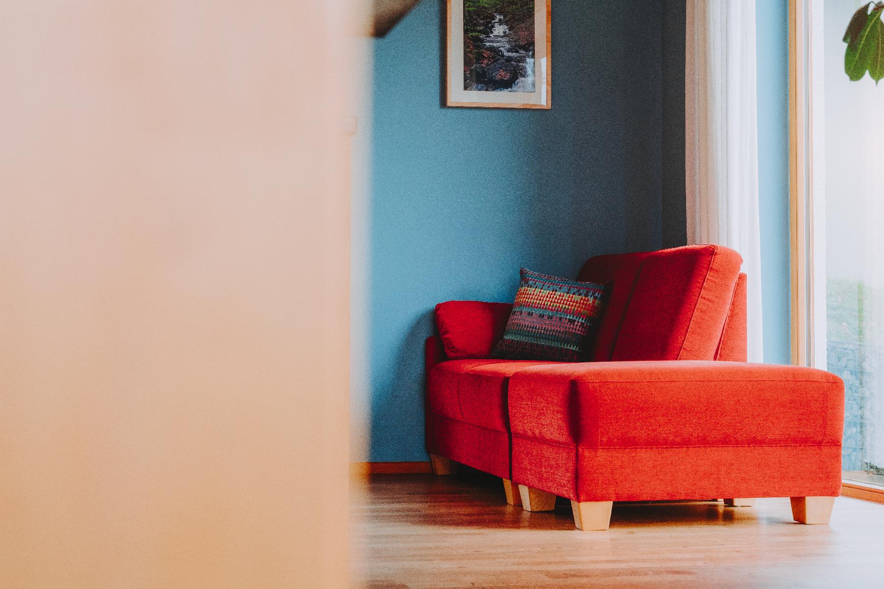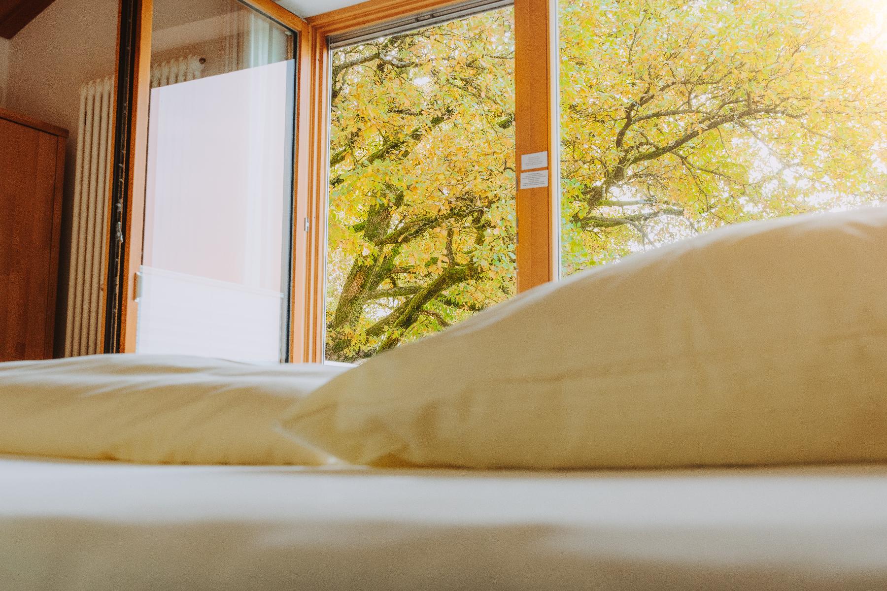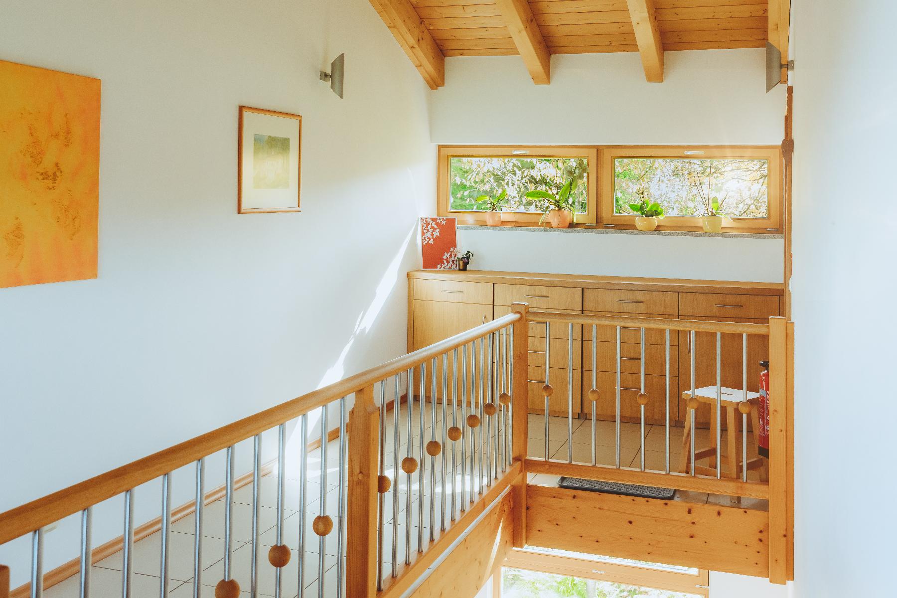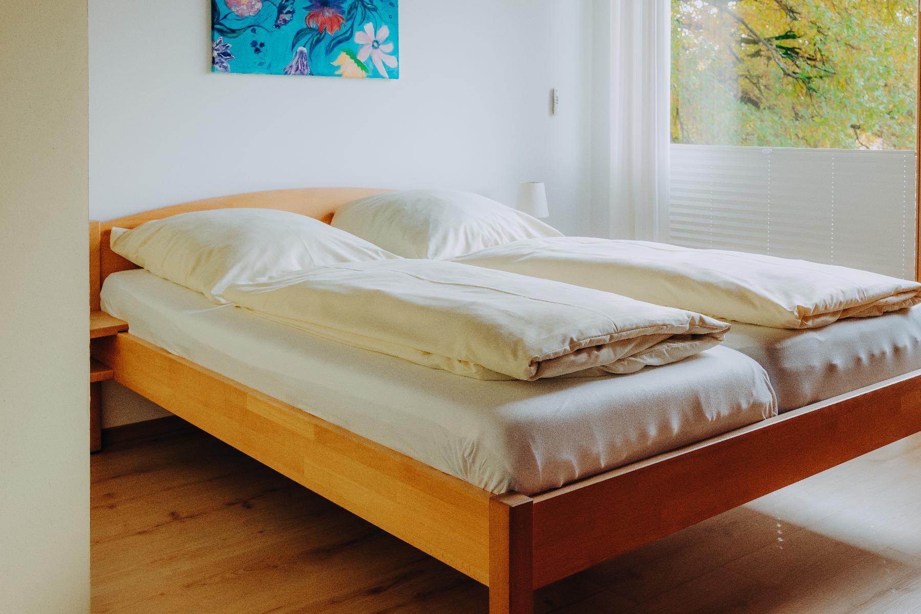 Mini-Appartements 3 und 4 (21 m²) im 2. Stock, Balkon mit Sitzgruppe. Im Mini-Appartement hochwertiger Purline Bioboden, Vollholzschrank, Sofa, Wasserkocher, kleiner Kühlschrank, schreinergefertigtes Frühstückseck. Doppelbett (160 cm) aus Vollholz mit verstellbaren Lattenrosten und Wende-Matratzen in wählbarer Festigkeit. Große oder kleinere Kopfkissen zur Wahl. Bettwäsche und Handtücher inklusive. Badezimmer mit DU/WC und wohliger Fußbodenheizung. Wenn Sie gerne kochen (und anschließend aufräumen). dürfen Sie unsere tolle, voll ausgestattete Küche im Gemeinschaftsraum im Erdgeschoss nutzen.