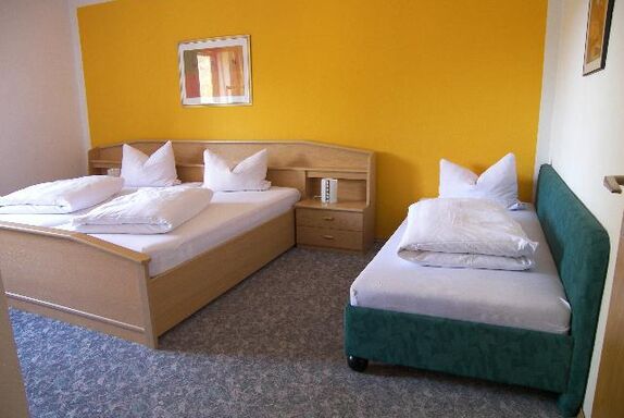 Ferienwohnung W 3 befindet sich im 1. Stock, hat 65 m² und besteht aus einem Wohnraum mit Kochzeile, 2 Schlafzimmern mit je einem Doppelbett und einmal zusätzlich mit einem Einzelbett, DU/WC, Diele und Balkon.