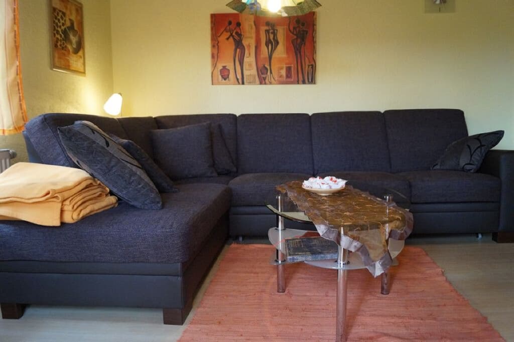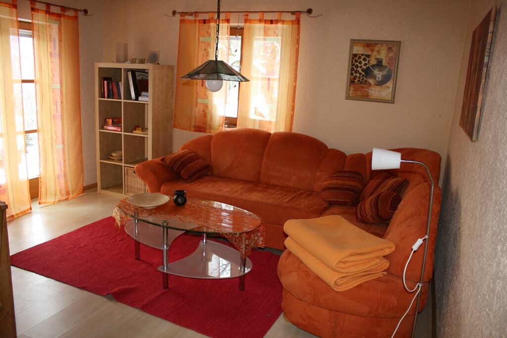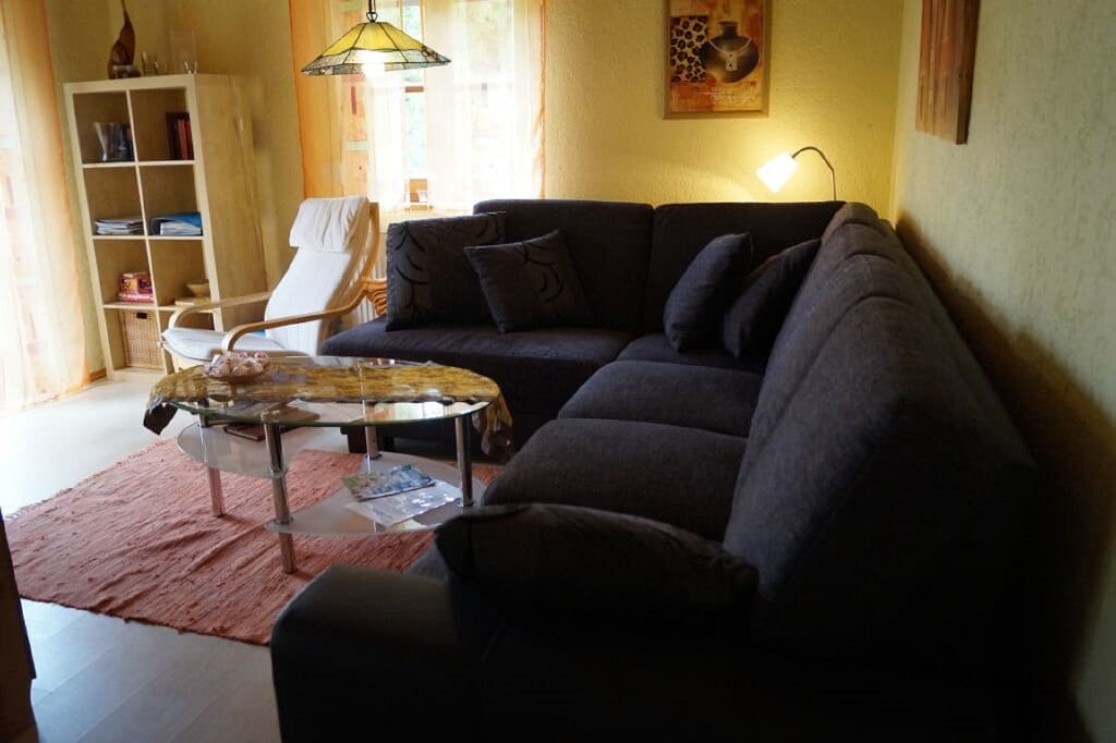 • Wohnzimmer mit Wohncouch, Couchtisch und SAT-TV; Musikanlage mit CD-Player und Radio, DVD-Player; Fußboden: Laminat