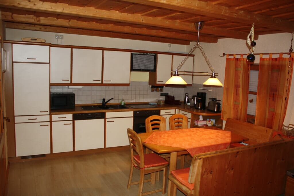 • offene Küche mit Essplatz, Küchenzeile, 4-Plattenherd mit Backofen, Kühl-/ Gefrierkombination, Geschirrspüler, Mikrowelle, Toaster, Eierkocher, Kaffeemaschine; Fußboden: Laminat