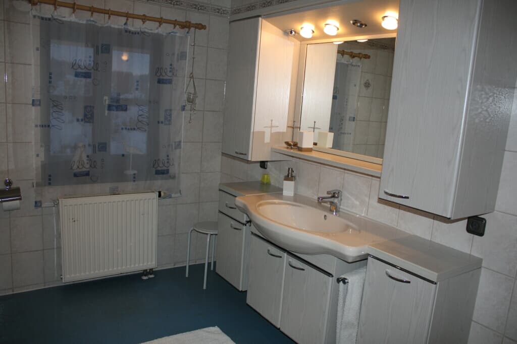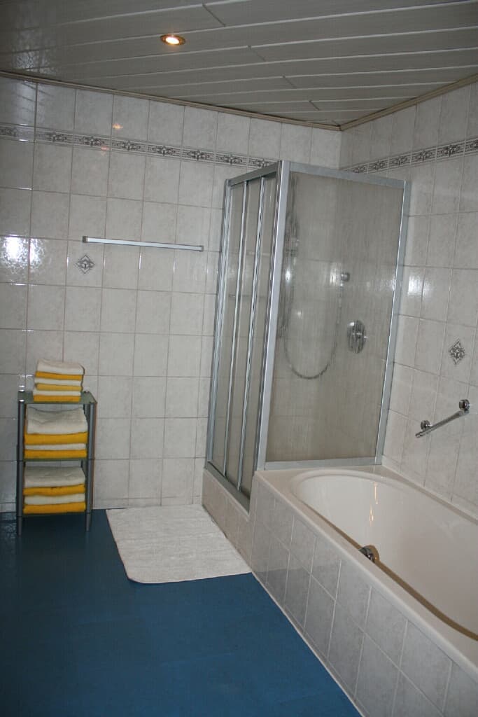 • Vollbad mit Dusche, Waschbecken mit Badschrank und grosser Spiegel, 2 WC im EG, Föhn; Fußboden: Kork