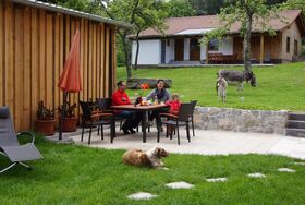 Der Hof liegt idyllisch am Waldrand in ruhiger Höhenlage mit weiter Fernsicht. Große Wiesen, Spielplatz, Trampolin, Tischtennis, Kicker und Liegestühle bieten Spaß und Entspannung für Groß und Klein.