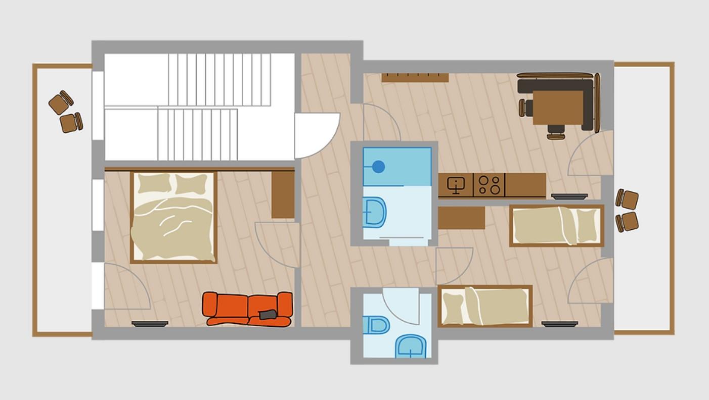 Appartement E - Zwei herrliche Aussichtsbalkone in wohltuender Ruhelage, zwei getrennte Schlafzimmer (optional weiteres Schlafzimmer mit eigenem Bad zubuchbar), Elternschlafzimmer mit zusätzlicher Schlafcouch, Wohnküche, Badezimmer und WC getrennt, Fernseher in beiden Zimmern und in der Küche sowie W-LAN. Ideal für bis zu fünf Gäste.