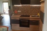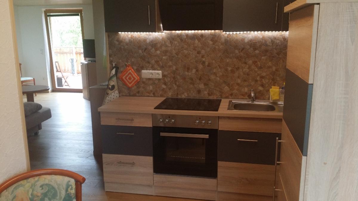 Küchenzeile und Wohnzimmer mit extra Schlafsofa.
