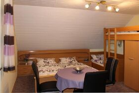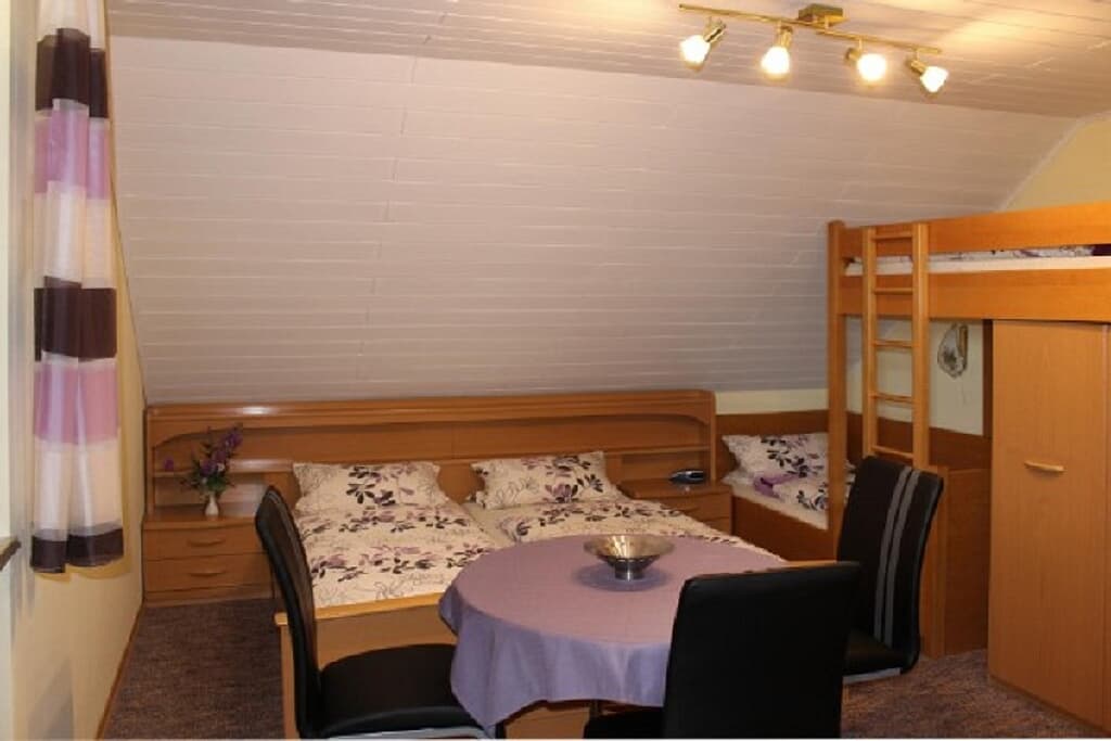 Das Familienzimmer verfügt über ein Doppelbett, 1 Einzelbett und 1 Etagenbett (nur für Kinder).
