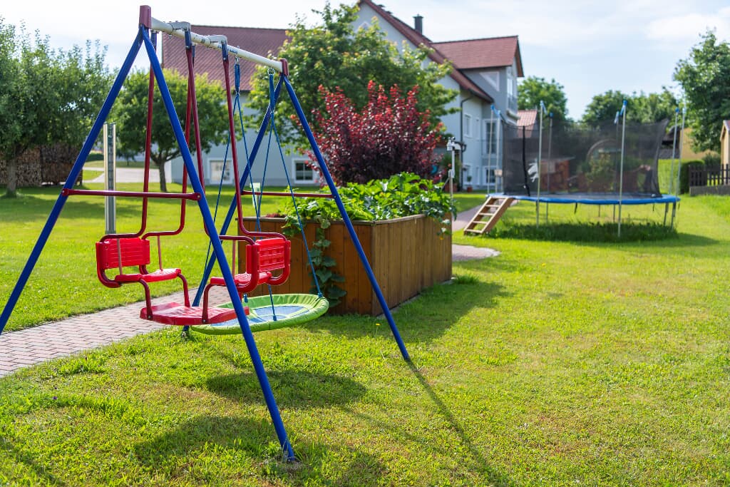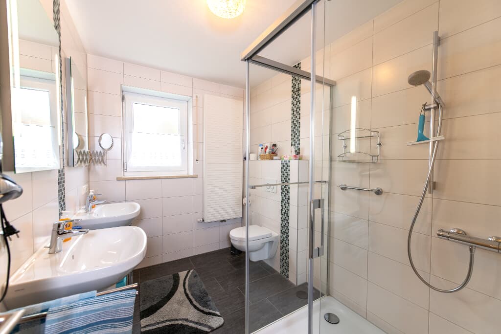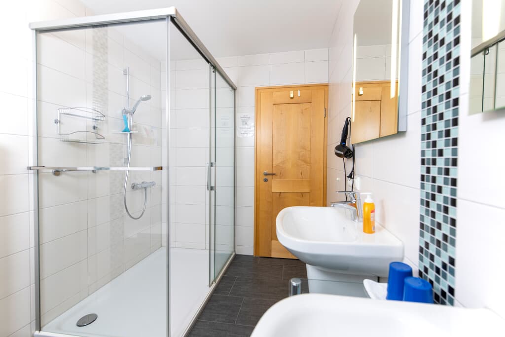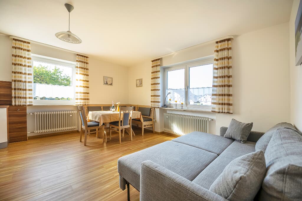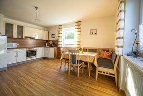 Verbringen Sie Ihren Urlaub im Erlebnisdorf Moosbach. Unsere Ferienwohnung im Erdgeschoss mit 104 m² mit Südbalkon verfügt über zwei Schlafzimmer mit je einen Doppelbett sowie einer Schlafcouch in der Wohnküche und ist für zwei bis fünf Personen geeignet. Auch ein Kinderbett steht Ihnen zur Verfügung. Das neue Bad ist mit einer großen ebenerdiger Dusche und 2 Waschbecken sowie WC ausgestattet. Außerdem befindet sich in der Wohnung ein zusätzliches WC.  Die neue Küchenzeile ist mit allen notwendigen Geräten  wie Herd, Backofen, Mikrowolle, Kühl- und Gefrierkombination, Kaffeemaschine, Toaster,  Eierkocher, Wasserkocher, Allesschneider, Mixer sowie ausreichend Geschirr, Gläsern und Besteck ausgestattet. Eine gemütliche Essecke und eine zusätzliche Couch  vervollständigen die moderne Wohnküche. Im Wohnzimmer finden Sie eine gemütliche Couchgarnitur zum Kuscheln und Erholen sowie ein Flachbildfernseher mit Sat-Anschluss. Für Regentage liegen Spiele und Bücher bereit. Ein eigener Balkon mit Tisch, Stühlen und Markise sowie Liegen für den Garten laden zum Erholen und Entspannen ein. Selbstverständlich ist Bett- und Tischwäsche vorhanden. Geschirr-, Hand-, Badetücher und Föhn liegen bereit. Natürlich befindet sich in der Ferienwohnung ein Bügelbrett und Bügeleisen. Auch ein Näh- und Schuhputzset liegt für Sie bereit. WLAN steht für Sie kostenfrei zur Verfügung.