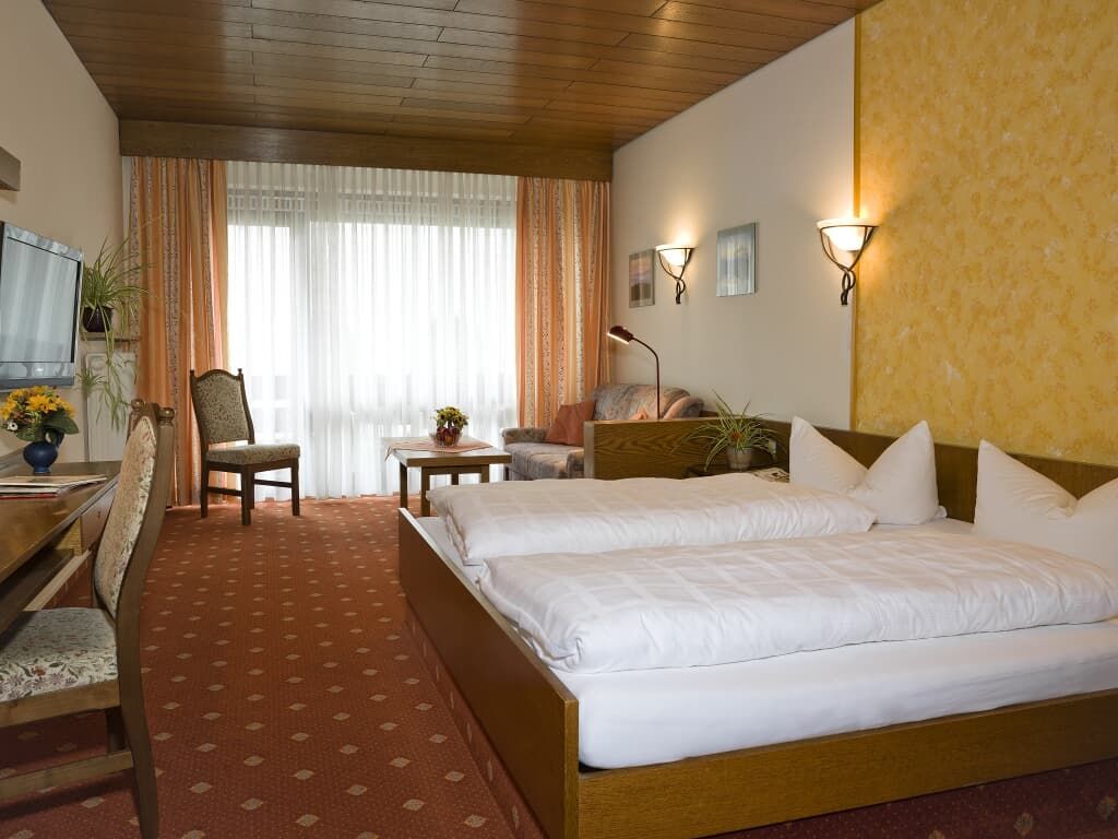 Sie wohnen in komfortablen, geräumigen Zimmern mit Dusche / WC oder Bad / WC und Balkon. Über WLAN haben Sie kostenfreien Zugang zum Internet.