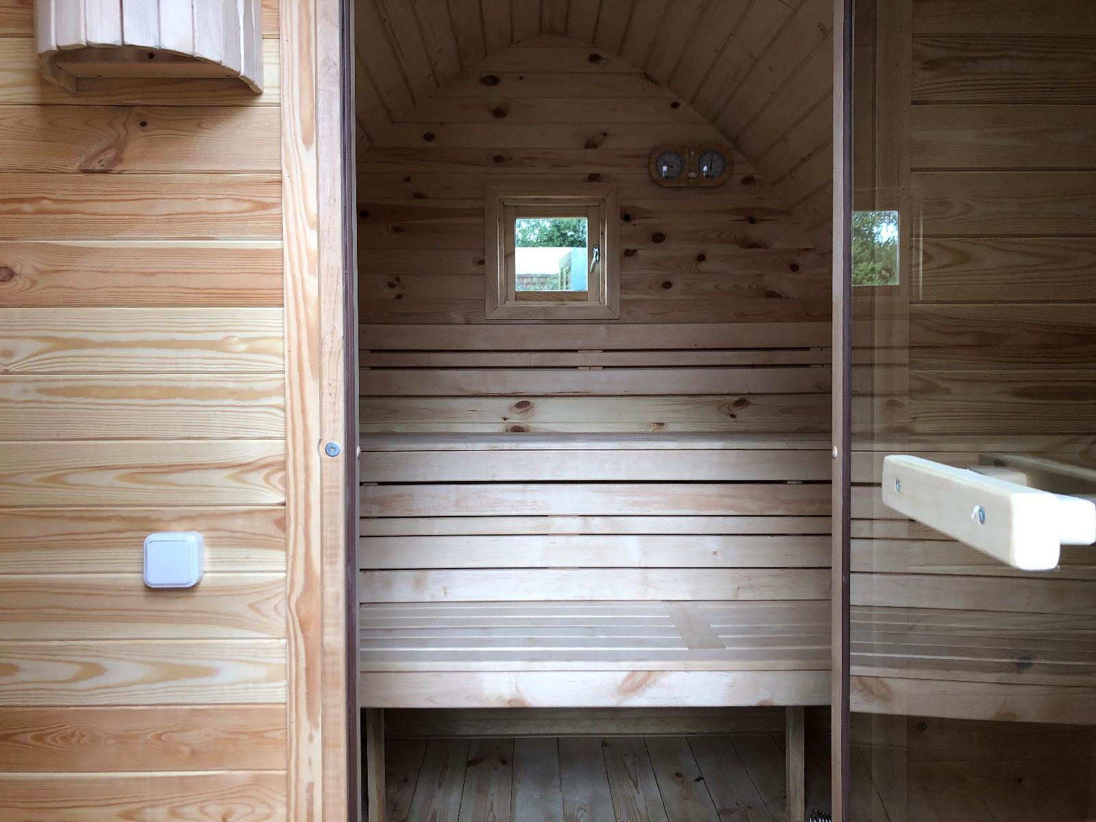 o Lagerfeuerstelle mit Sitzgruppe oder Sonnenliegen sowie Saunahaus mit Außendusche